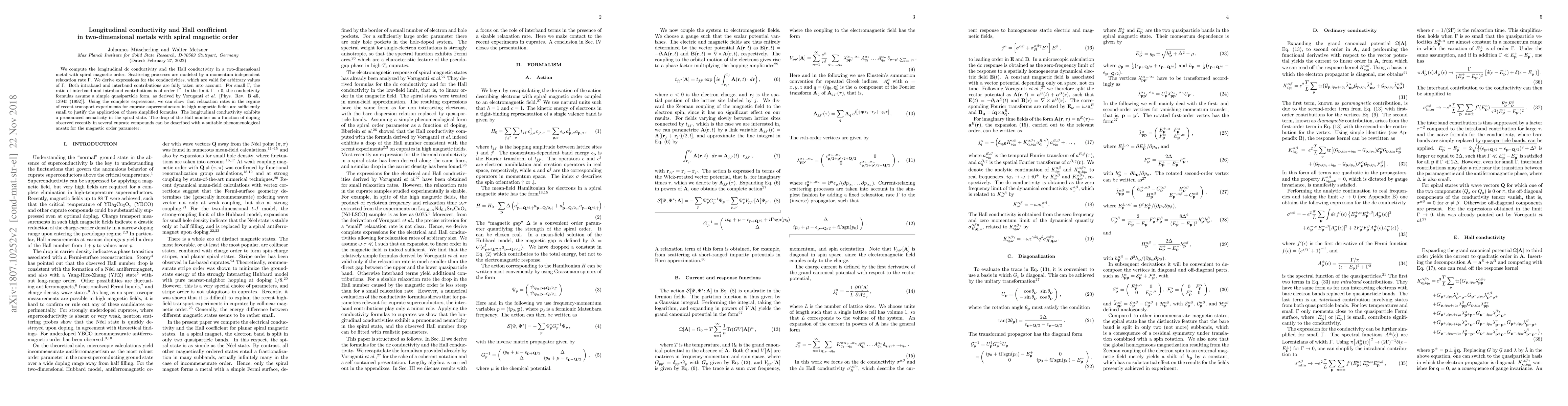 We compute the longitudinal dc conductivity and the Hall conductivity in a two-dimensional metal with spiral magnetic order. Scattering processes are modeled by a momentum-independent relaxation rate $\Gamma$. We derive expressions for the conductivities, which are valid for arbitrary values of $\Gamma$. Both intraband and interband contributions are fully taken into account. For small $\Gamma$, the ratio of interband and intraband contributions is of order $\Gamma^2$. In the limit $\Gamma \to 0$, the conductivity formulas assume a simple quasiparticle form, as derived by Voruganti et. al. [Phys. Rev. B 45, 13945 (1992)]. Using the complete expressions, we can show that relaxation rates in the regime of recent transport experiments for cuprate superconductors in high magnetic fields are sufficiently small to justify the application of these simplified formulas. The longitudinal conductivity exhibits a pronounced nematicity in the spiral state. The drop of the Hall number as a function of doping observed recently in several cuprate compounds can be described with a suitable phenomenological ansatz for the magnetic order parameter.