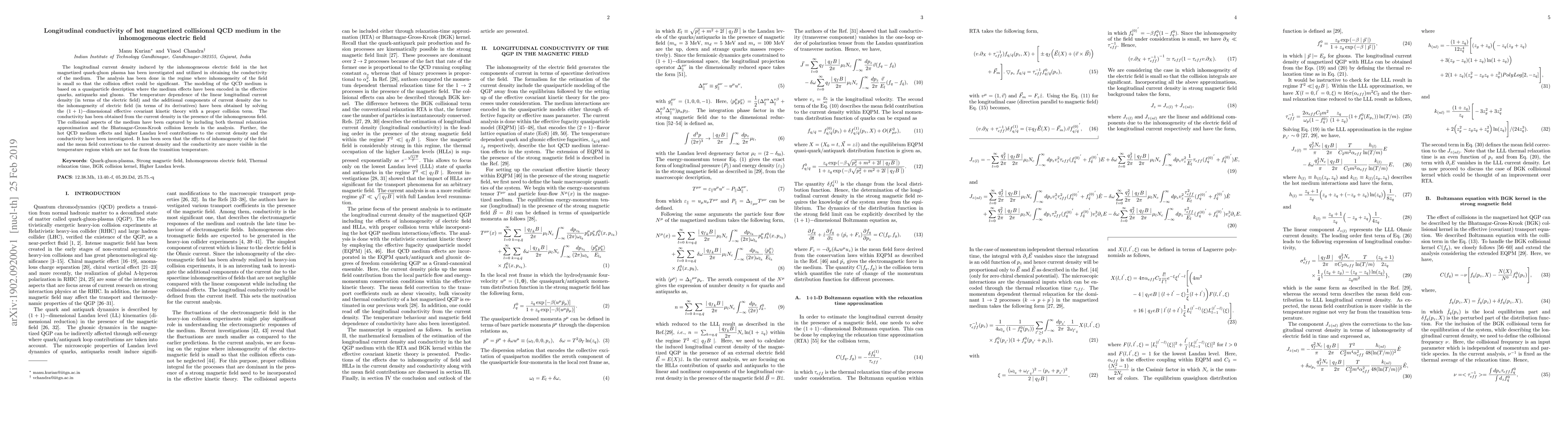The longitudinal current density induced by the inhomogeneous electric field in the hot magnetized quark-gluon plasma has been investigated and utilized in obtaining the conductivity of the medium. The analysis has been done in the regime where inhomogeneity of the field is small so that the collision effect could be significant. The modeling of the QCD medium is based on a quasiparticle description where the medium effects have been encoded in the effective quarks, antiquarks and gluons. The temperature dependence of the linear longitudinal current density (in terms of the electric field) and the additional components of current density due to the inhomogeneity of electric field (in terms of its derivatives) have been obtained by solving the $(1+1)-$dimensional effective covariant kinetic theory with a proper collision term. The conductivity has been obtained from the current density in the presence of the inhomogeneous field. The collisional aspects of the medium have been captured by including both thermal relaxation approximation and the Bhatnagar-Gross-Krook collision kernels in the analysis. Further, the hot QCD medium effects and higher Landau level contributions to the current density and the conductivity have been investigated. It has been seen that the effects of inhomogeneity of the field and the mean field corrections to the current density and the conductivity are more visible in the temperature regions which are not far from the transition temperature.