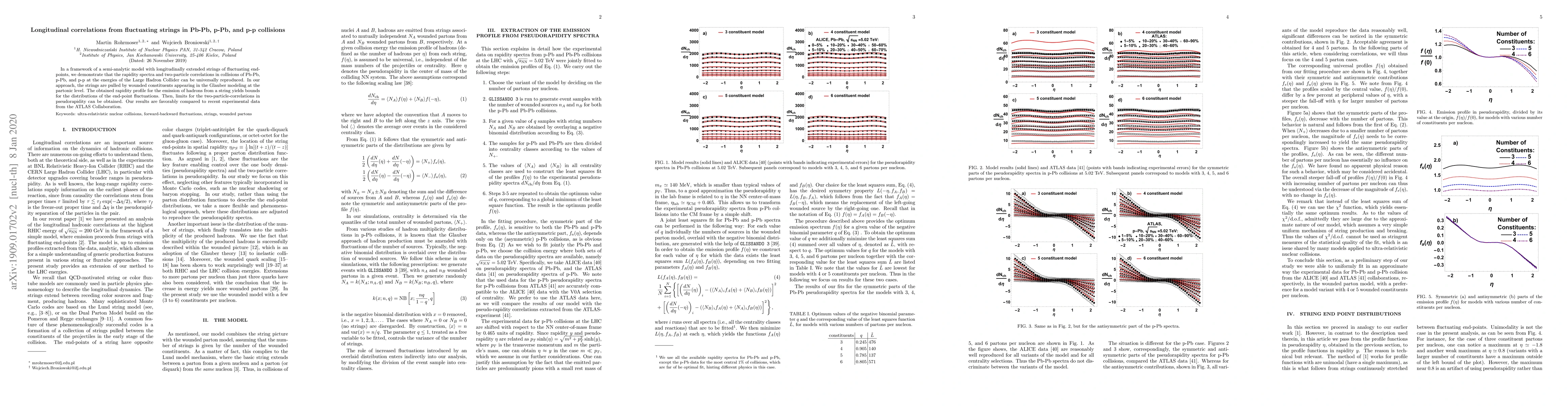 This paper uses a semi-analytic model of fluctuating strings to reproduce the rapidity spectra and two-particle correlations in heavy-ion and proton collisions at LHC energies. The model's predictions align well with recent ATLAS experimental data, providing insights into the dynamics of hadron emission.