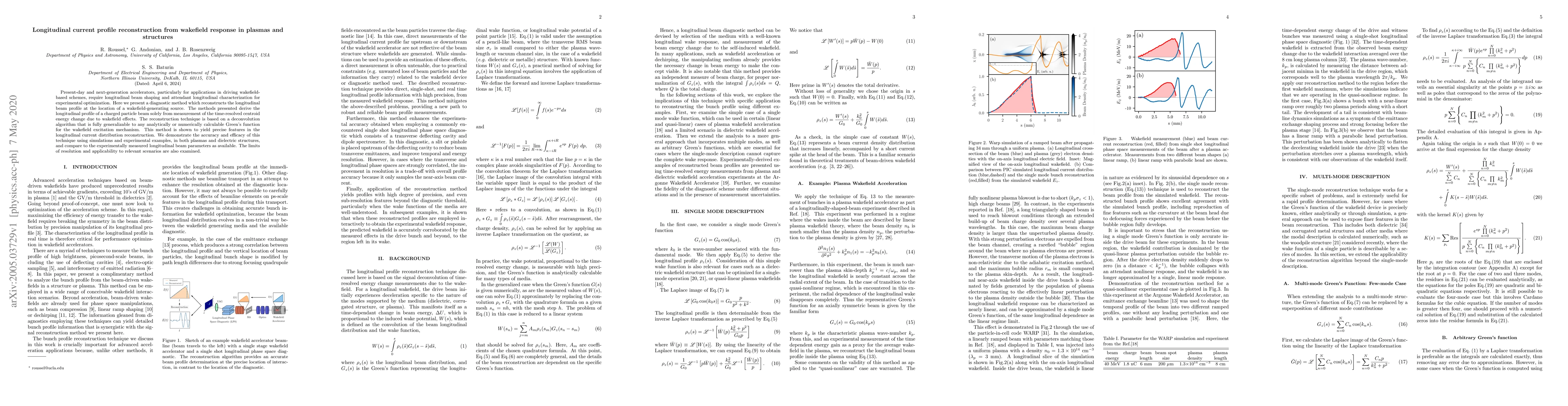 This paper introduces a diagnostic method for reconstructing the longitudinal profile of charged particle beams in accelerators by measuring wakefield-induced energy changes. The technique uses a deconvolution algorithm based on the wakefield excitation mechanism's Green's function, validated through simulations and experiments in plasmas and dielectric structures.