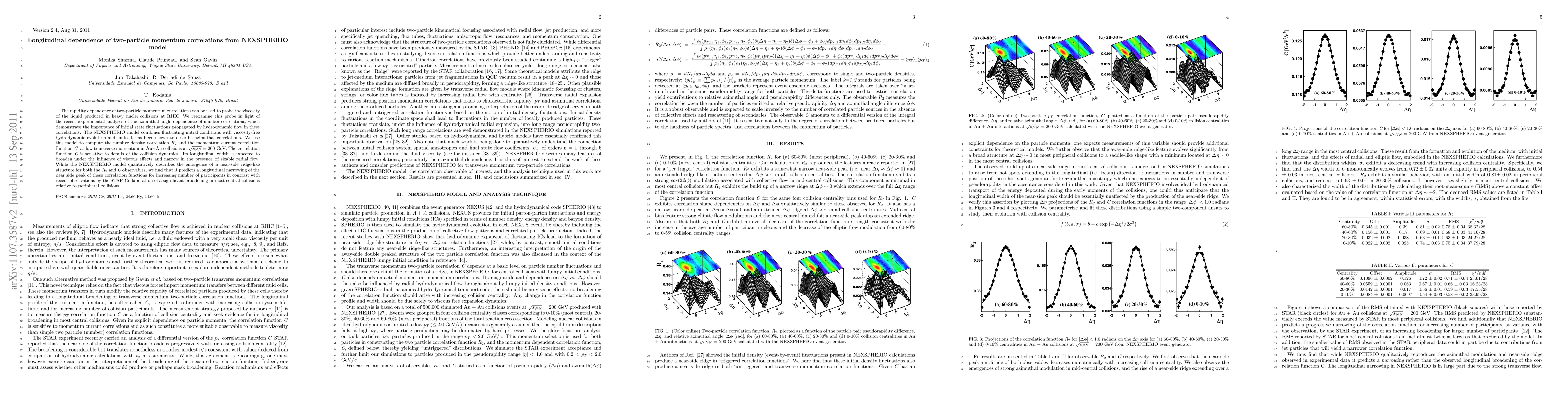 The rapidity dependence of two-particle momentum correlations can be used to probe the viscosity of the liquid produced in heavy nuclei collisions at RHIC. We reexamine this probe in light of the recent experimental analyses of the azimuthal-angle dependence of number correlations, which demonstrate the importance of initial state fluctuations propagated by hydrodynamic flow in these correlations. The NEXSPHERIO model combines fluctuating initial conditions with viscosity-free hydrodynamic evolution and, indeed, has been shown to describe azimuthal correlations. We use this model to compute the number density correlation $R_{2}$ and the momentum current correlation function {\it C}, at low transverse momentum in Au+Au collisions at $\sqrt{s_{NN}} = $~200 GeV. {\it C} is sensitive to details of the collision dynamics. Its longitudinal width is expected to broaden under the influence of viscous effects and narrow in the presence of sizable radial flow. While NEXSPHERIO model qualitatively describes the emergence of a near-side ridge-like structure for both the $R_2$ and {\it C} observables, we find that it predicts a longitudinal narrowing of the near side peak of these correlation functions for increasing number of participants in contrast with recent observations by the STAR Collaboration of a significant broadening in most central collisions relative to peripheral collisions.