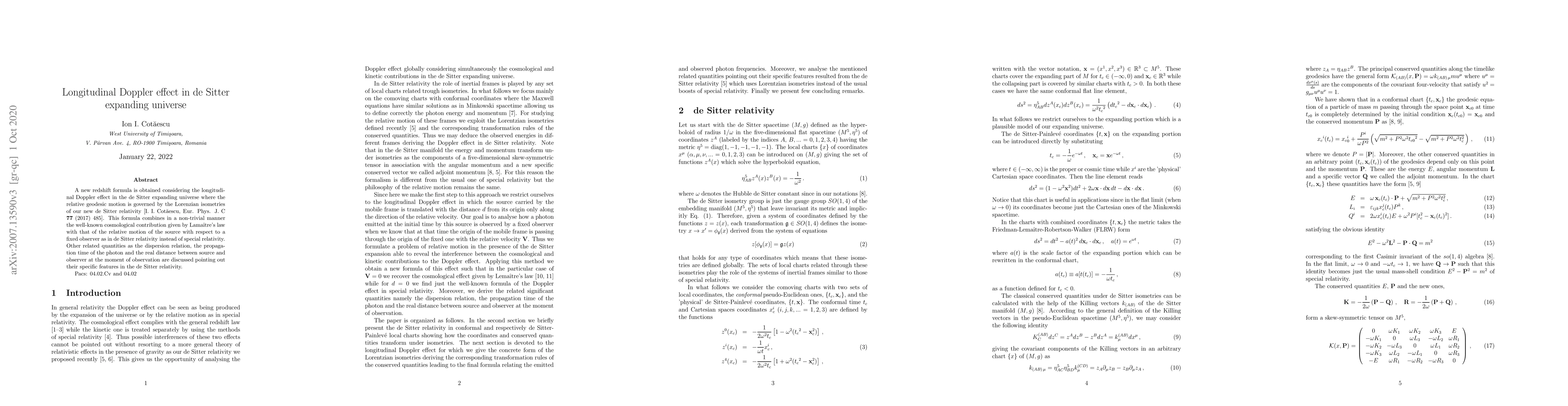 A new redshift formula is obtained considering the longitudinal Doppler effect in the de Sitter expanding universe where the relative geodesic motion is governed by the Lorenzian isometries of our new de Sitter relativity [I. I. Cot\u aescu, {Eur. Phys. J. C} {\bf 77} (2017) 485]. This formula combines in a non-trivial manner the well-known cosmological contribution given by Lama\' itre's law with that of the relative motion of the source with respect to a fixed observer as in de Sitter relativity instead of special relativity. Other related quantities as the dispersion relation, the propagation time of the photon and the real distance between source and observer at the moment of observation are discussed pointing out their specific features in the de Sitter relativity.