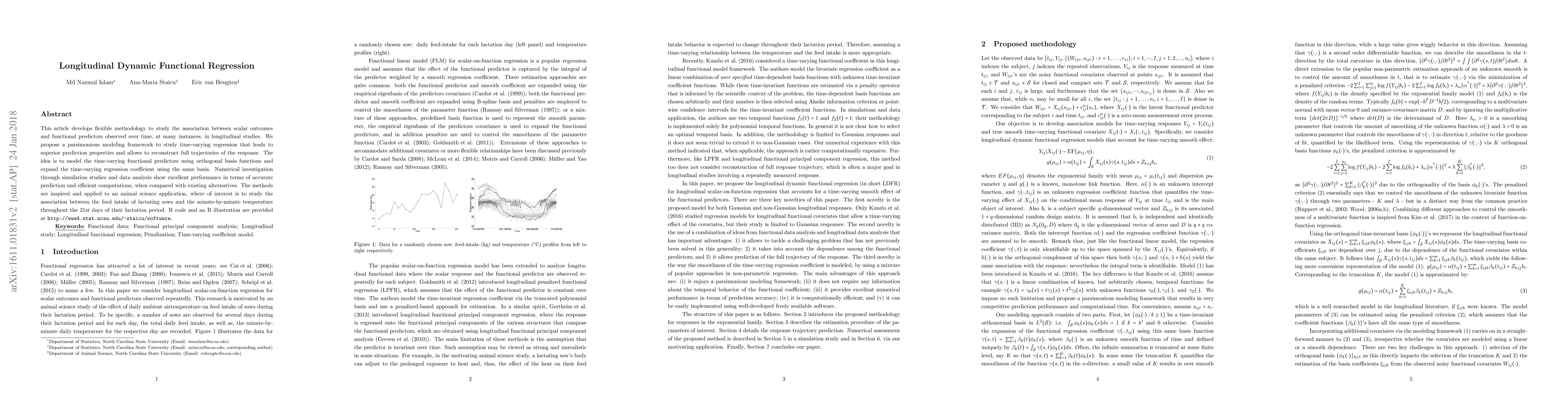 This paper introduces a new method for analyzing longitudinal data with time-varying predictors, allowing for accurate predictions and efficient computations. The approach is demonstrated using an animal science example studying the relationship between a sow's feed intake and temperature during lactation.