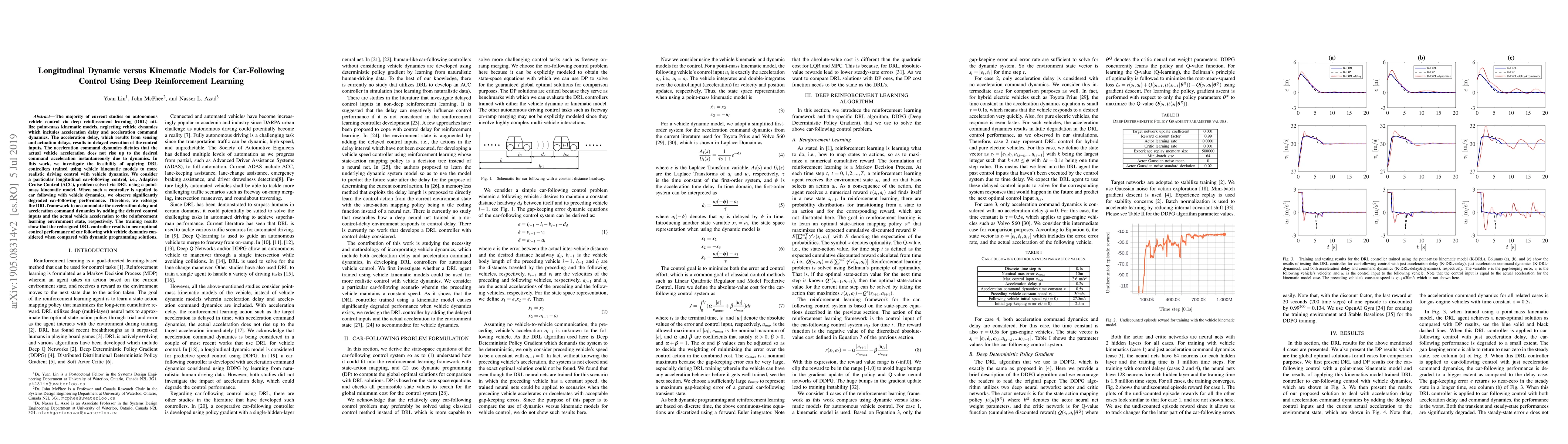 The majority of current studies on autonomous vehicle control via deep reinforcement learning (DRL) utilize point-mass kinematic models, neglecting vehicle dynamics which includes acceleration delay and acceleration command dynamics. The acceleration delay, which results from sensing and actuation delays, results in delayed execution of the control inputs. The acceleration command dynamics dictates that the actual vehicle acceleration does not rise up to the desired command acceleration instantaneously due to dynamics. In this work, we investigate the feasibility of applying DRL controllers trained using vehicle kinematic models to more realistic driving control with vehicle dynamics. We consider a particular longitudinal car-following control, i.e., Adaptive Cruise Control (ACC), problem solved via DRL using a point-mass kinematic model. When such a controller is applied to car following with vehicle dynamics, we observe significantly degraded car-following performance. Therefore, we redesign the DRL framework to accommodate the acceleration delay and acceleration command dynamics by adding the delayed control inputs and the actual vehicle acceleration to the reinforcement learning environment state, respectively. The training results show that the redesigned DRL controller results in near-optimal control performance of car following with vehicle dynamics considered when compared with dynamic programming solutions.