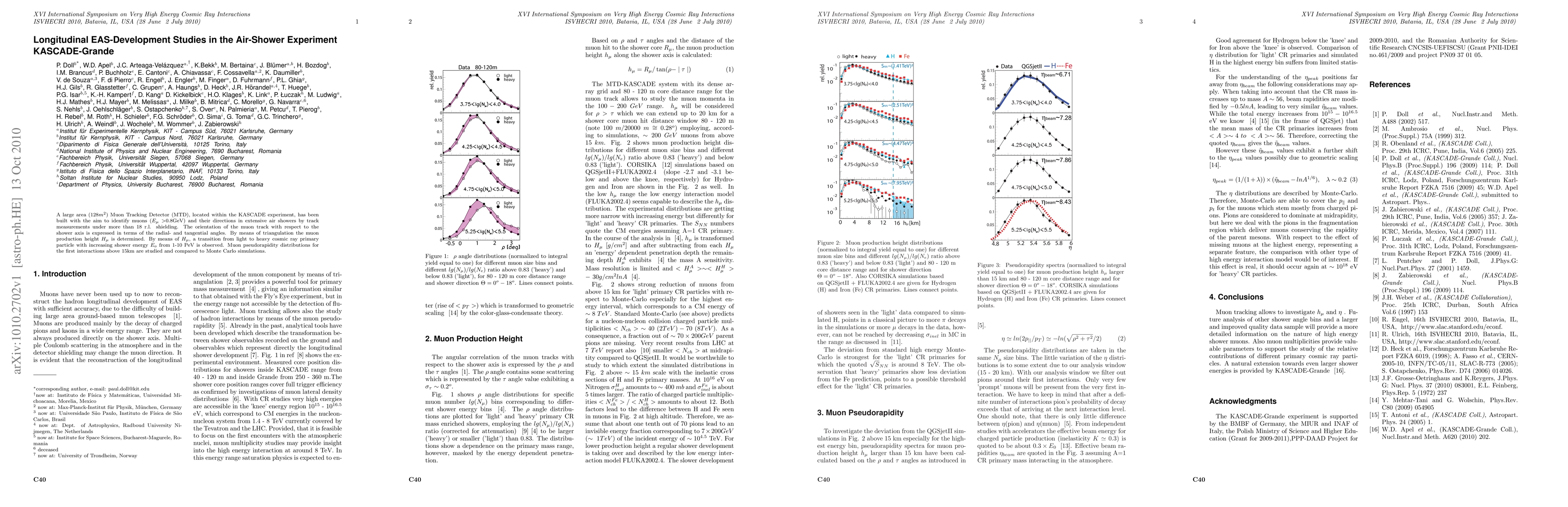 A large area (128 m^2) Muon Tracking Detector (MTD), located within the KASCADE experiment, has been built with the aim to identify muons (E_mu > 0.8 GeV) and their directions in extensive air showers by track measurements under more than 18 r.l. shielding. The orientation of the muon track with respect to the shower axis is expressed in terms of the radial- and tangential angles. By means of triangulation the muon production height H_mu is determined. By means of H_mu, a transition from light to heavy cosmic ray primary particle with increasing shower energy Eo from 1-10 PeV is observed. Muon pseudorapidity distributions for the first interactions above 15 km are studied and compared to Monte Carlo simulations.