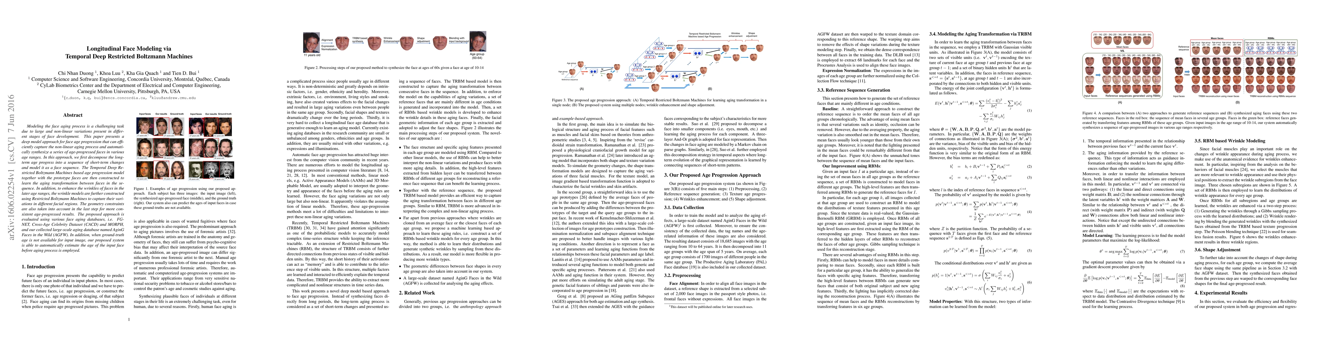This paper proposes a deep learning model using Temporal Deep Restricted Boltzmann Machines to model and synthesize the non-linear face aging process, breaking it down into short-term changes, and incorporating wrinkle models and geometry constraints for more realistic age progression. The model is evaluated on multiple aging databases and can estimate input face ages when ground truth is unavailable.