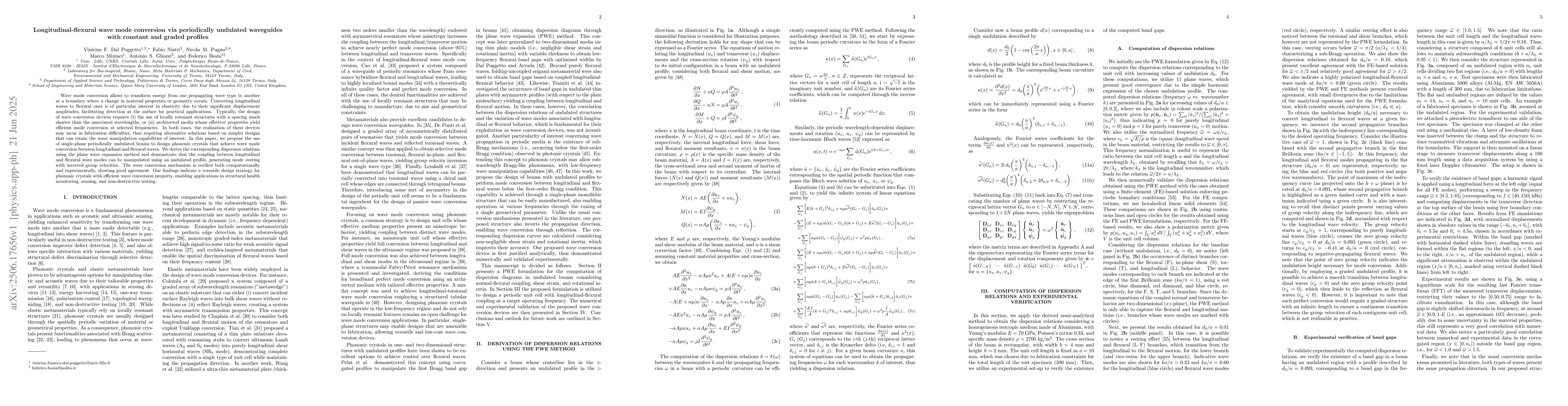 Wave mode conversion allows to transform energy from one propagating wave type to another at a boundary where a change in material properties or geometry occurs. Converting longitudinal waves to flexural ones is of particular interest in elasticity due to their significant displacement amplitudes, facilitating detection at the surface for practical applications. Typically, the design of wave conversion devices requires (i) the use of locally resonant structures with a spacing much shorter than the associated wavelengths, or (ii) architected media whose effective properties yield efficient mode conversion at selected frequencies. In both cases, the realization of these devices may incur in fabrication difficulties, thus requiring alternative solutions based on simpler designs that can retain the wave manipulation capabilities of interest. In this paper, we propose the use of single-phase periodically undulated beams to design phononic crystals that achieve wave mode conversion between longitudinal and flexural waves. We derive the corresponding dispersion relations using the plane wave expansion method and demonstrate that the coupling between longitudinal and flexural wave modes can be manipulated using an undulated profile, generating mode veering with inverted group velocities. The wave conversion mechanism is verified both computationally and experimentally, showing good agreement. Our findings indicate a versatile design strategy for phononic crystals with efficient wave conversion property, enabling applications in structural health monitoring, sensing, and non-destructive testing.
