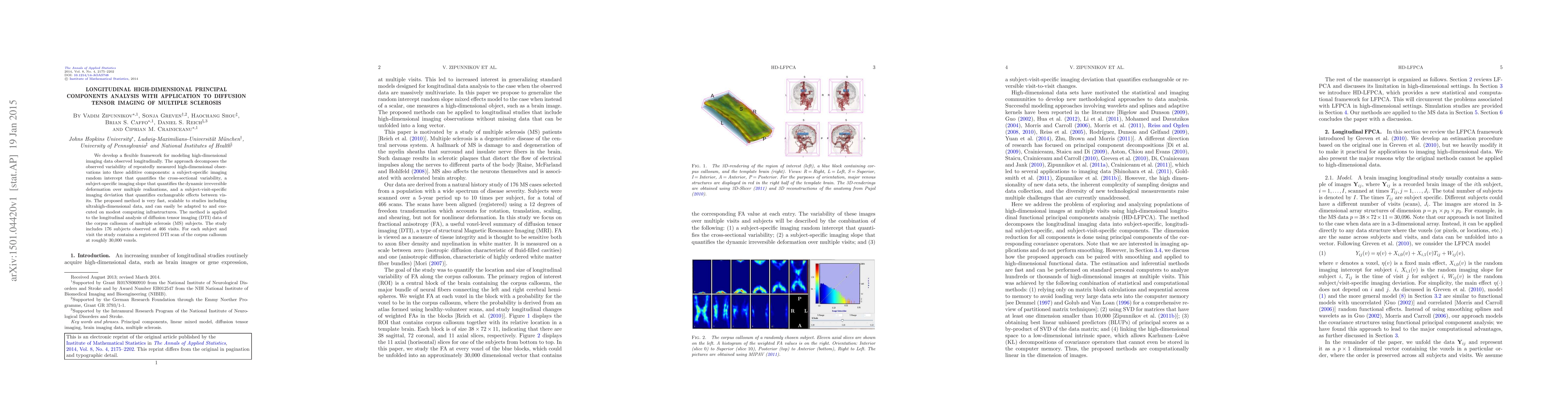 Researchers developed a new method to analyze complex medical imaging data from multiple sclerosis patients, revealing insights into the disease's progression over time. The approach uses high-dimensional principal components analysis to identify patterns in diffusion tensor imaging data.