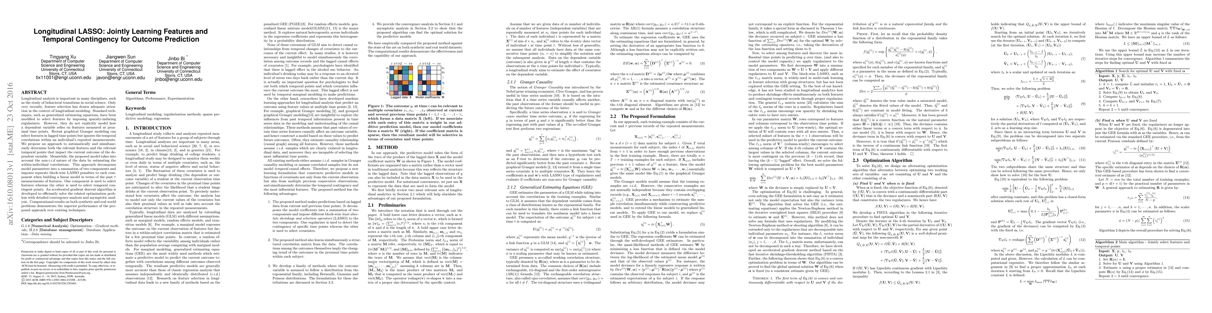 A new approach, Longitudinal LASSO, jointly learns relevant features and temporal contingency for outcome prediction in longitudinal data, outperforming existing techniques with superior performance on synthetic and real-world problems.