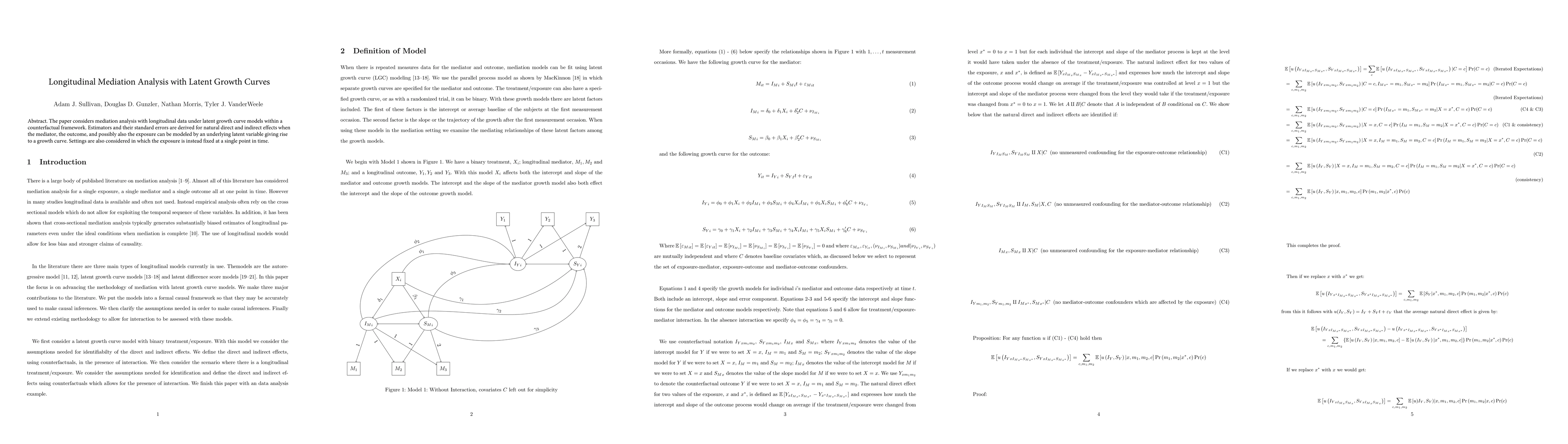 This paper develops methods for mediation analysis in longitudinal data using latent growth curve models, deriving estimators and standard errors for direct and indirect effects within a counterfactual framework, applicable when mediators, outcomes, and exposures are modeled as latent variables or fixed at a single time point.