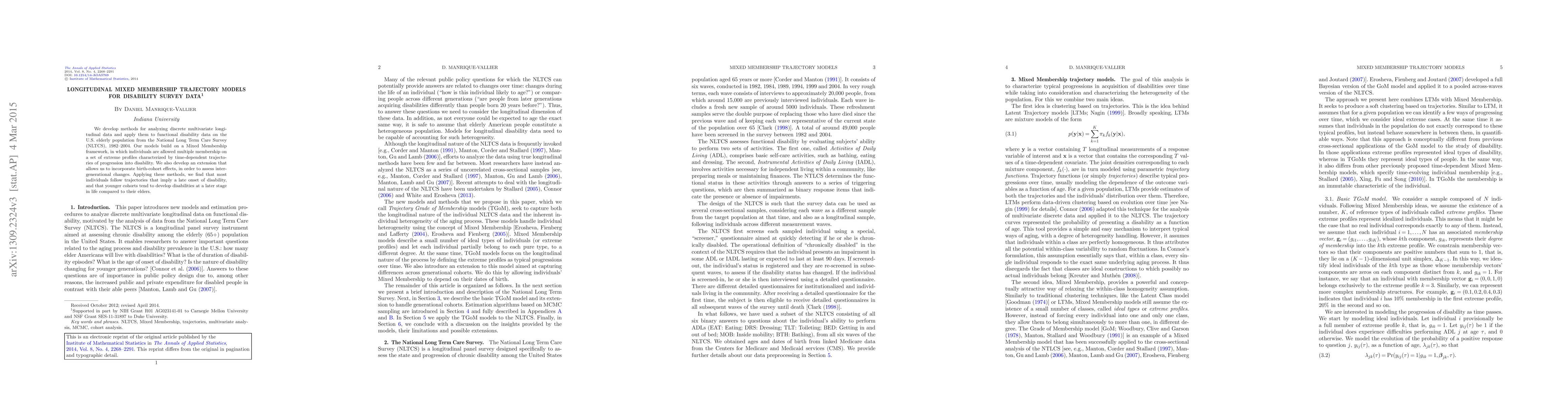 This paper develops mixed membership trajectory models to analyze the progression of disability in the U.S. elderly population from the National Long Term Care Survey (1982-2004). The study reveals that most individuals experience a late onset of disability, with younger cohorts showing a trend of developing disabilities later than older generations.