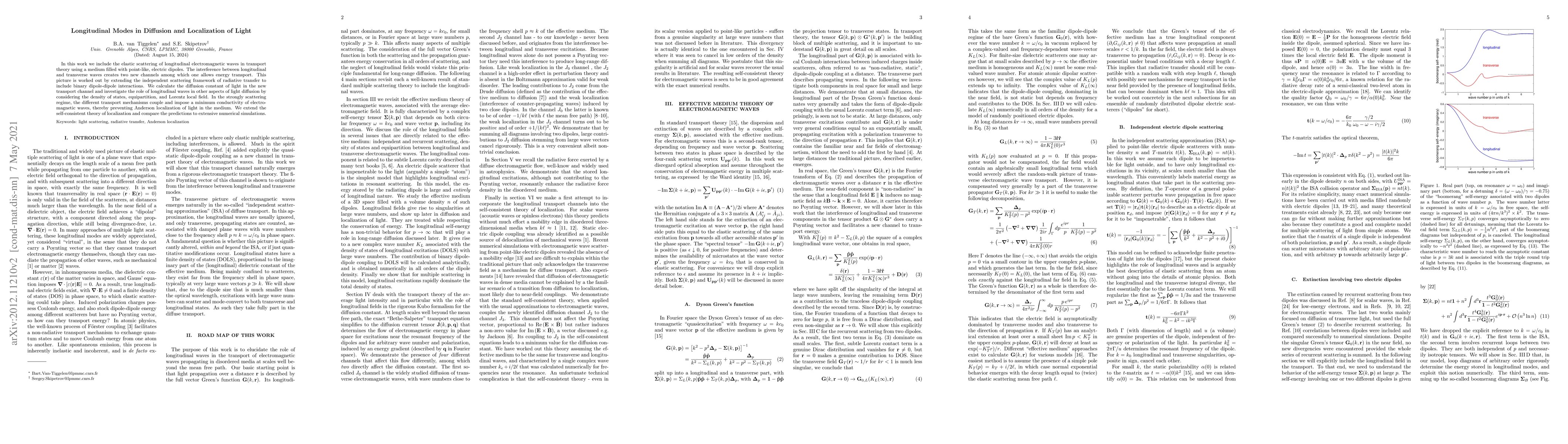 In this work we include the elastic scattering of longitudinal electromagnetic waves in transport theory using a medium filled with point-like, electric dipoles. The interference between longitudinal and transverse waves creates two new channels among which one allows energy transport. This picture is worked out by extending the independent scattering framework of radiative transfer to include binary dipole-dipole interactions. We calculate the diffusion constant of light in the new transport channel and investigate the role of longitudinal waves in other aspects of light diffusion by considering the density of states, equipartition, and Lorentz local field. In the strongly scattering regime, the different transport mechanisms couple and impose a minimum conductivity of electromagnetic waves, thereby preventing Anderson localization of light in the medium. We extend the self-consistent theory of localization and compare the predictions to extensive numerical simulations.