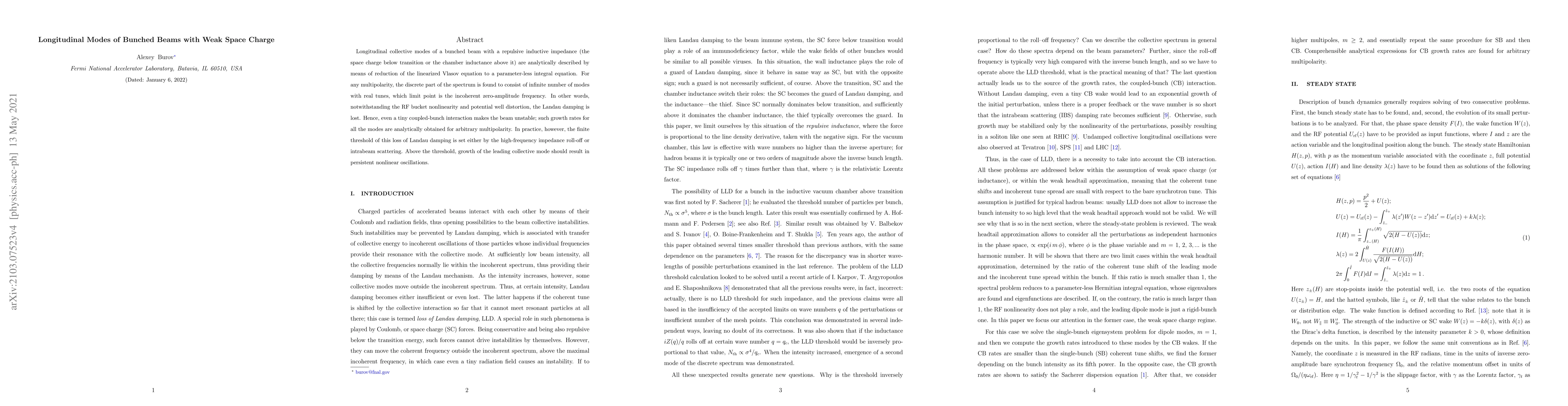 This paper analytically describes the longitudinal collective modes of bunched beams with weak space charge, revealing that Landau damping is lost, leading to beam instability due to coupled-bunch interactions. The study finds that the growth rates for these modes are obtained analytically, with practical stability thresholds set by high-frequency impedance or intrabeam scattering.