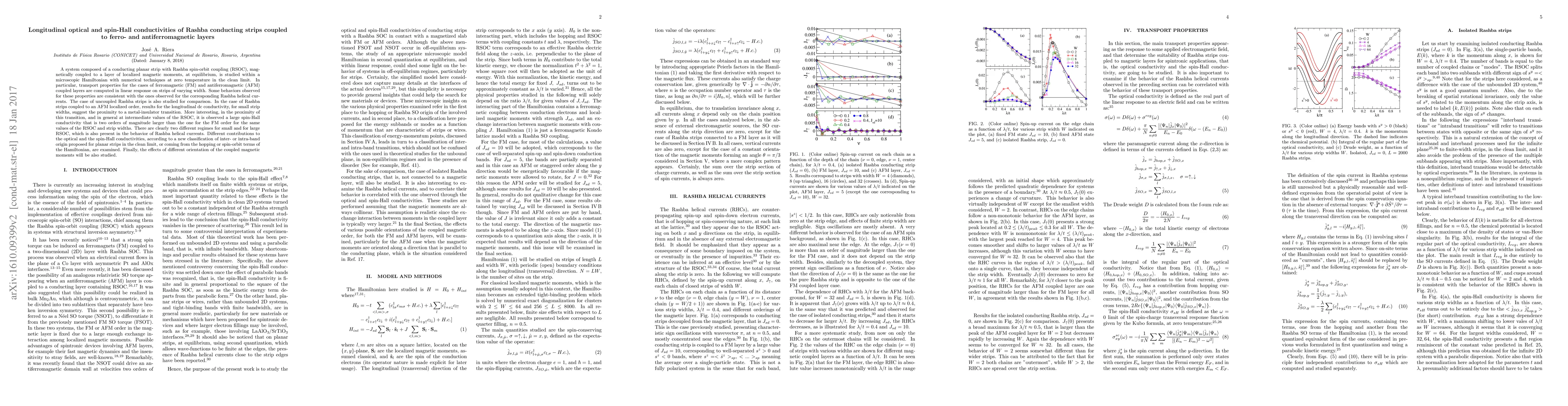 This paper investigates the longitudinal optical and spin-Hall conductivities in Rashba conducting strips coupled to ferromagnetic or antiferromagnetic layers, revealing significant differences in spin-Hall conductivity between the two magnetic orders. It finds a large spin-Hall conductivity near a metal-insulator transition in antiferromagnetically coupled strips, highlighting distinct regimes based on Rashba spin-orbit coupling strength.