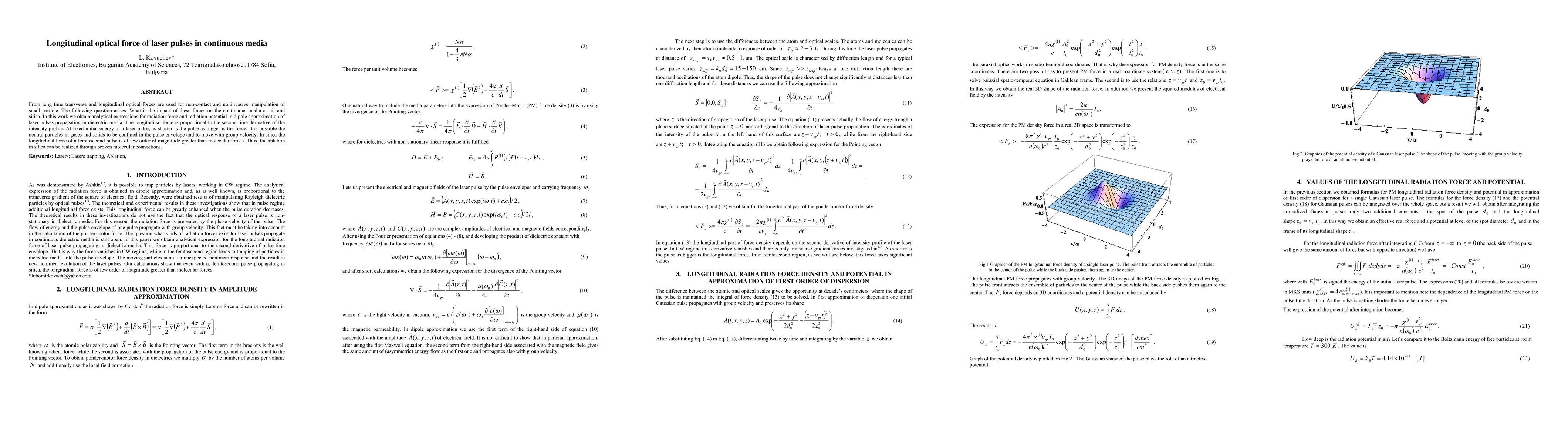 From long time transverse and longitudinal optical forces are used for non-contact and noninvasive manipulation of small particle. The following question arises: What is the impact of these forces on the continuous media as air and silica. In this work we obtain analytical expressions for radiation force and radiation potential in dipole approximation of laser pulses propagating in dielectric media. The longitudinal force is proportional to the second time derivative of the intensity profile. At fixed initial energy of a laser pulse, as shorter is the pulse as bigger is the force. It is possible the neutral particles in gases and solids be confined in the pulse envelope and to move with group velocity. In silica the longitudinal force of a femtosecond pulse is of few order of magnitude greater than molecular forces. Thus, the ablation in silica can be realized through broken molecular connections.