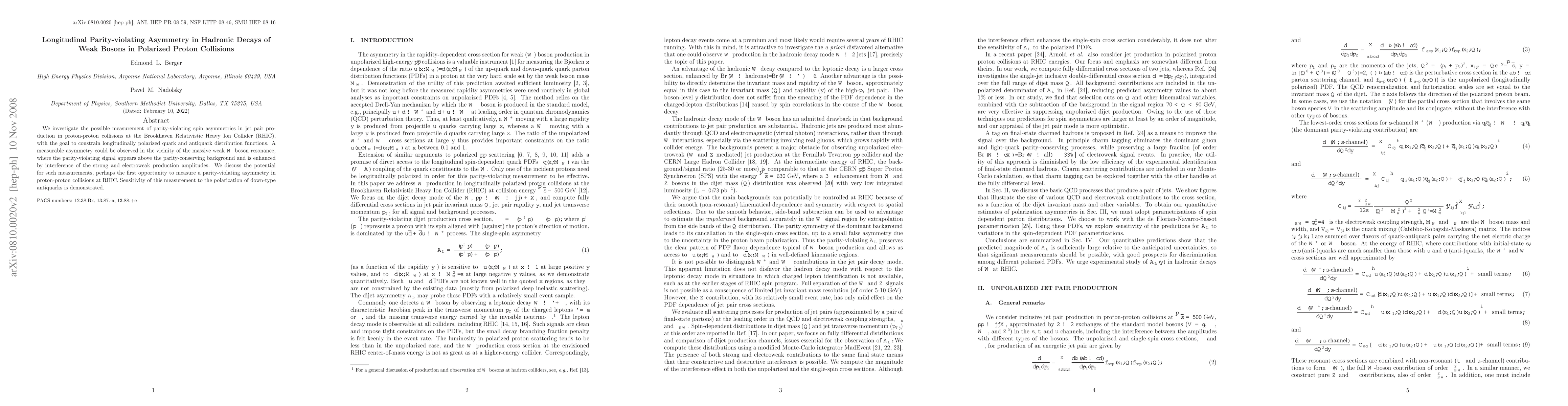 We investigate the possible measurement of parity-violating spin asymmetries in jet pair production in proton-proton collisions at the Brookhaven Relativistic Heavy Ion Collider (RHIC), with the goal to constrain longitudinally polarized quark and antiquark distribution functions. A measurable asymmetry could be observed in the vicinity of the massive weak W boson resonance, where the parity-violating signal appears above the parity-conserving background and is enhanced by interference of the strong and electroweak production amplitudes. We discuss the potential for such measurements, perhaps the first opportunity to measure a parity-violating asymmetry in proton-proton collisions at RHIC. Sensitivity of this measurement to the polarization of down-type antiquarks is demonstrated.