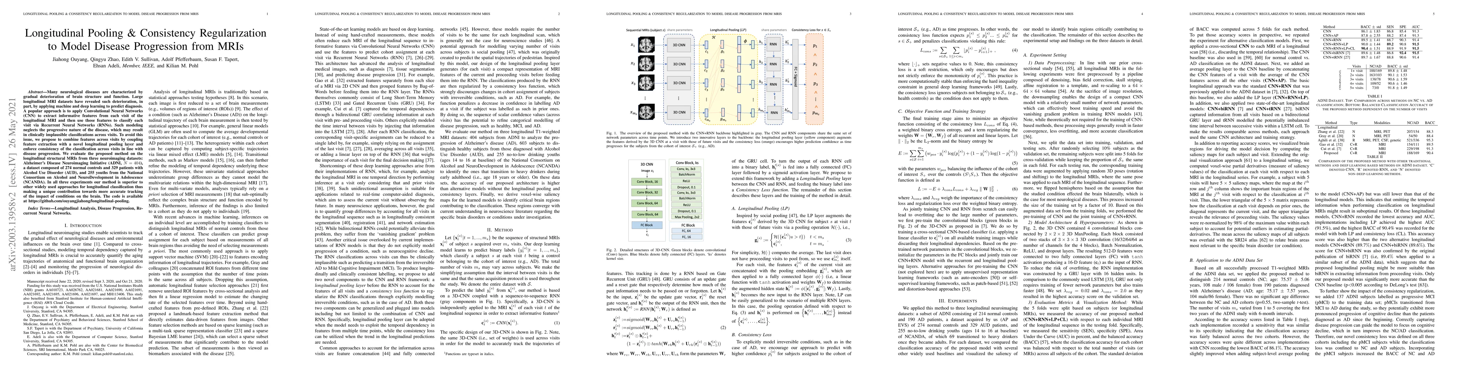 This paper proposes a method combining longitudinal pooling and consistency regularization to model disease progression from longitudinal MRIs, addressing the progressive nature of neurological diseases. The method outperforms other approaches in classifying longitudinal MRIs from Alzheimer's Disease, Alcohol Use Disorder, and adolescent neurodevelopment datasets, contributing to more accurate tracking of brain condition impacts.
