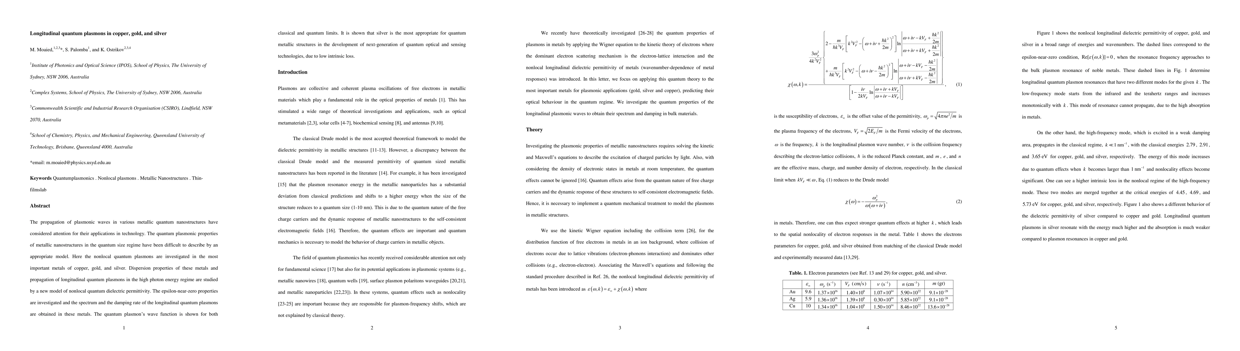 This paper investigates the propagation of longitudinal quantum plasmons in copper, gold, and silver using a new nonlocal quantum dielectric model, revealing silver's suitability for next-generation quantum technologies due to its low intrinsic loss and favorable plasmonic properties.