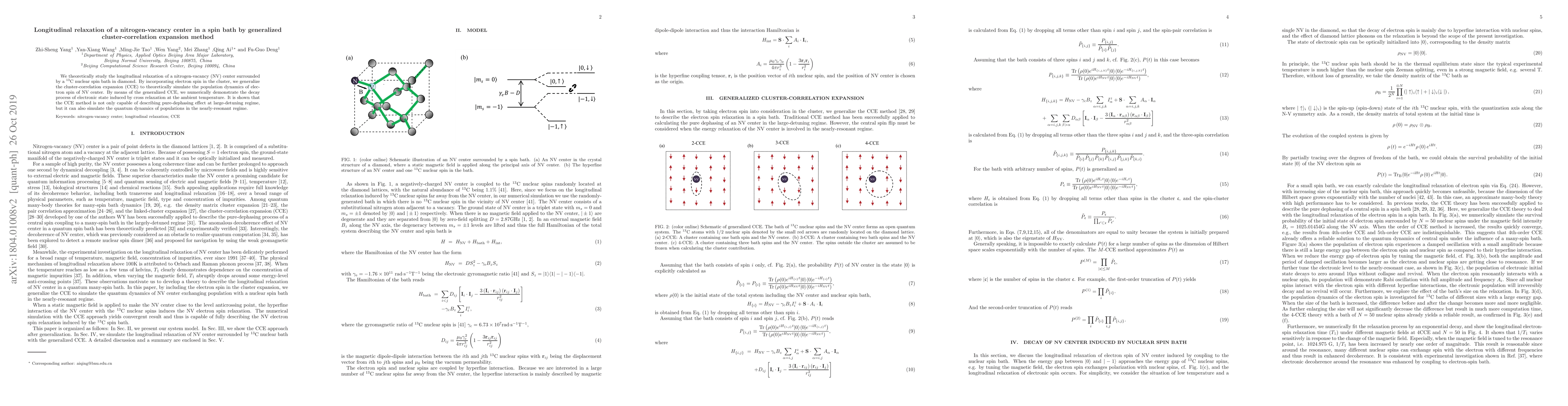 This paper theoretically investigates the longitudinal relaxation of a nitrogen-vacancy (NV) center in diamond using a generalized cluster-correlation expansion (CCE) method. The study demonstrates the method's ability to simulate the decay process of the NV center's electron spin due to cross relaxation in a 13C nuclear spin bath, showing its efficacy in both large-detuning and nearly-resonant regimes.