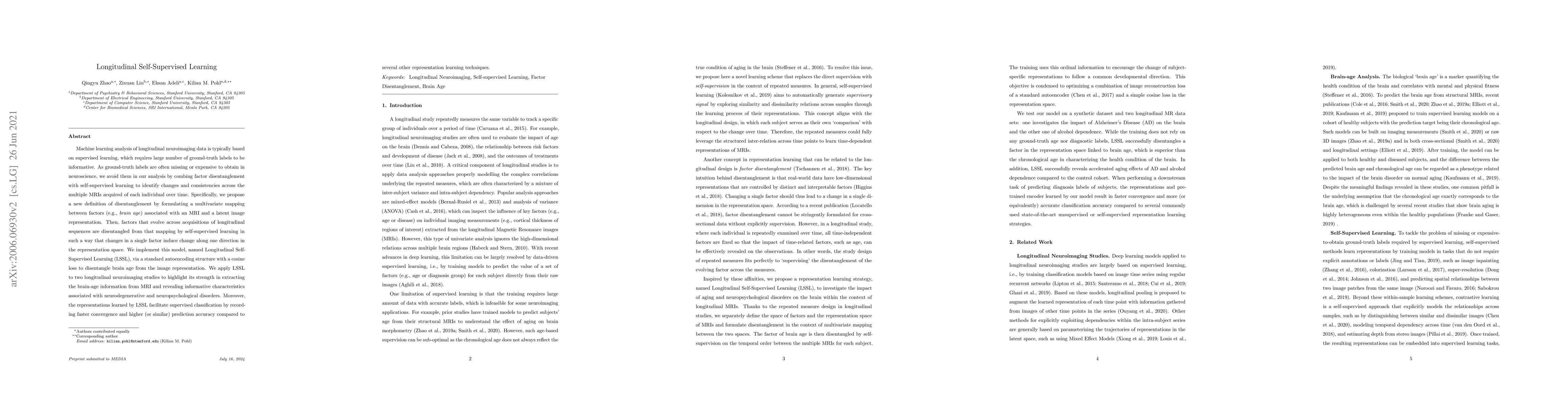 This paper proposes Longitudinal Self-Supervised Learning (LSSL) to analyze longitudinal neuroimaging data without requiring ground-truth labels, using factor disentanglement and self-supervised learning. LSSL effectively extracts brain-age information and reveals characteristics linked to neurodegenerative disorders, while also improving supervised classification performance.