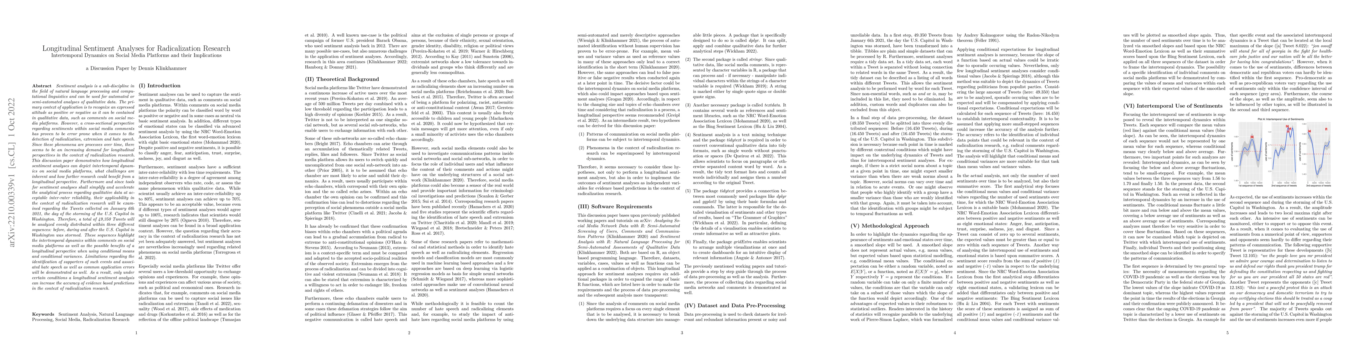 This discussion paper demonstrates how longitudinal sentiment analyses can depict intertemporal dynamics on social media platforms, what challenges are inherent and how further research could benefit from a longitudinal perspective. Furthermore and since tools for sentiment analyses shall simplify and accelerate the analytical process regarding qualitative data at acceptable inter-rater reliability, their applicability in the context of radicalization research will be examined regarding the Tweets collected on January 6th 2021, the day of the storming of the U.S. Capitol in Washington. Therefore, a total of 49,350 Tweets will be analyzed evenly distributed within three different sequences: before, during and after the U.S. Capitol in Washington was stormed. These sequences highlight the intertemporal dynamics within comments on social media platforms as well as the possible benefits of a longitudinal perspective when using conditional means and conditional variances. Limitations regarding the identification of supporters of such events and associated hate speech as well as common application errors will be demonstrated as well. As a result, only under certain conditions a longitudinal sentiment analysis can increase the accuracy of evidence based predictions in the context of radicalization research.