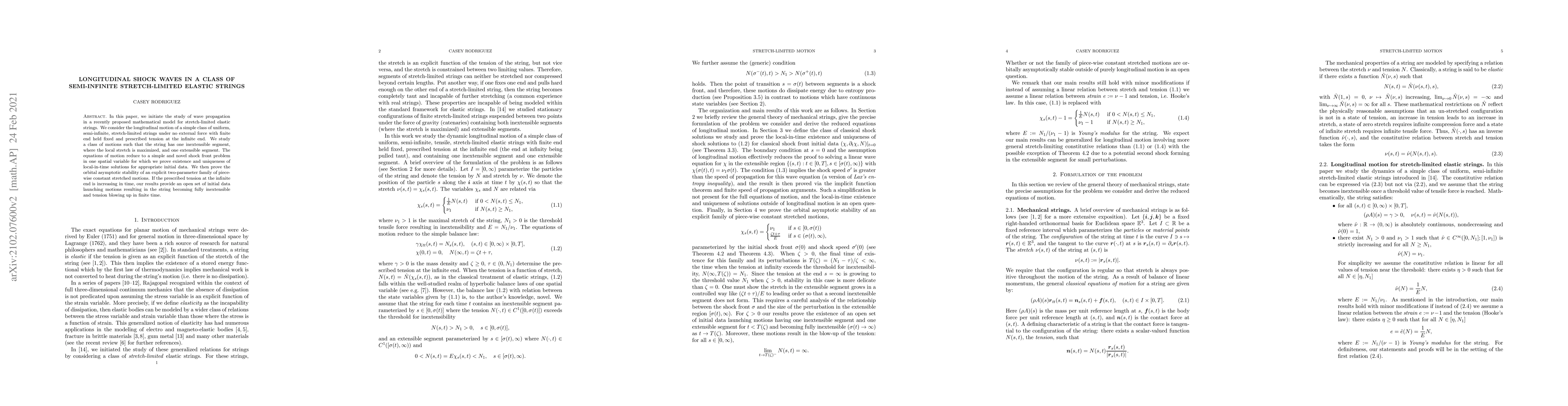 In this paper, we initiate the study of wave propagation in a recently proposed mathematical model for stretch-limited elastic strings. We consider the longitudinal motion of a simple class of uniform, semi-infinite, stretch-limited strings under no external force with finite end held fixed and prescribed tension at the infinite end. We study a class of motions such that the string has one inextensible segment, where the local stretch is maximized, and one extensible segment. The equations of motion reduce to a simple and novel shock front problem in one spatial variable for which we prove existence and uniqueness of local-in-time solutions for appropriate initial data. We then prove the orbital asymptotic stability of an explicit two-parameter family of piece-wise constant stretched motions. If the prescribed tension at the infinite end is increasing in time, our results provide an open set of initial data launching motions resulting in the string becoming fully inextensible and tension blowing up in finite time.