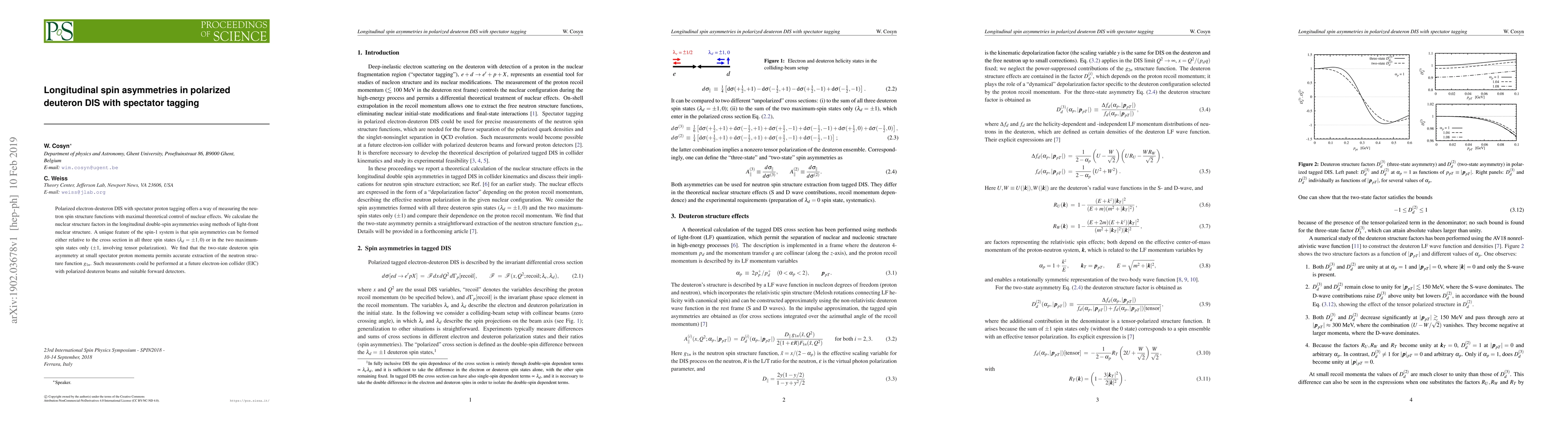 Polarized electron-deuteron DIS with spectator proton tagging offers a way of measuring the neutron spin structure functions with maximal theoretical control of nuclear effects. We calculate the nuclear structure factors in the longitudinal double-spin asymmetries using methods of light-front nuclear structure. A unique feature of the spin-1 system is that spin asymmetries can be formed either relative to the cross section in all three spin states ($\lambda_d = \pm 1, 0$) or in the two maximum-spin states only ($\pm 1$, involving tensor polarization). We find that the two-state deuteron spin asymmetry at small spectator proton momenta permits accurate extraction of the neutron structure function $g_{1n}$. Such measurements could be performed at a future electron-ion collider (EIC) with polarized deuteron beams and suitable forward detectors.