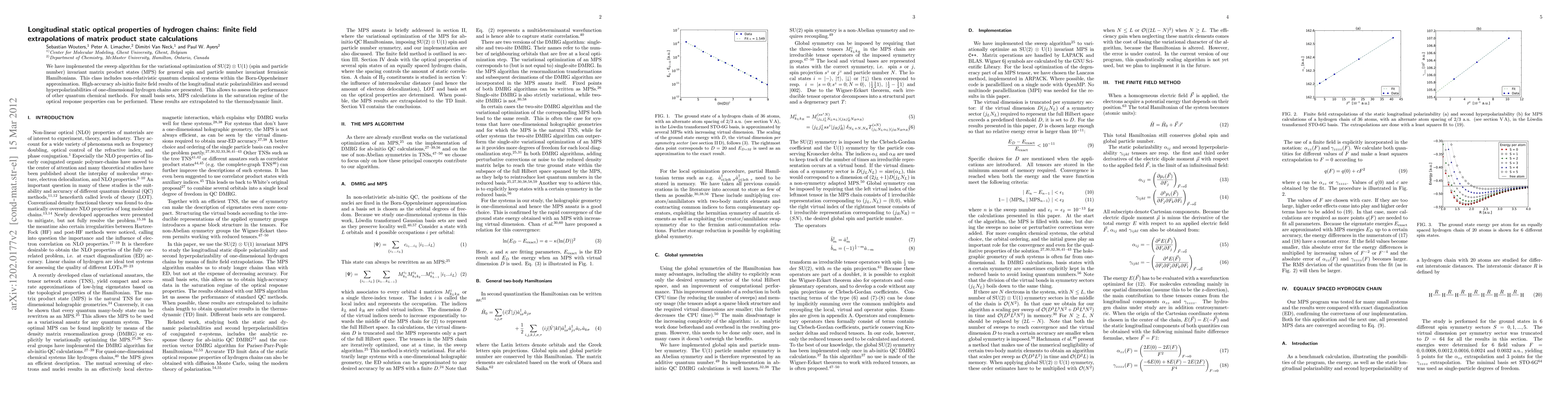 We have implemented the sweep algorithm for the variational optimization of SU(2) x U(1) (spin and particle number) invariant matrix product states (MPS) for general spin and particle number invariant fermionic Hamiltonians. This class includes non-relativistic quantum chemical systems within the Born-Oppenheimer approximation. High-accuracy ab-initio finite field results of the longitudinal static polarizabilities and second hyperpolarizabilities of one-dimensional hydrogen chains are presented. This allows to assess the performance of other quantum chemical methods. For small basis sets, MPS calculations in the saturation regime of the optical response properties can be performed. These results are extrapolated to the thermodynamic limit.