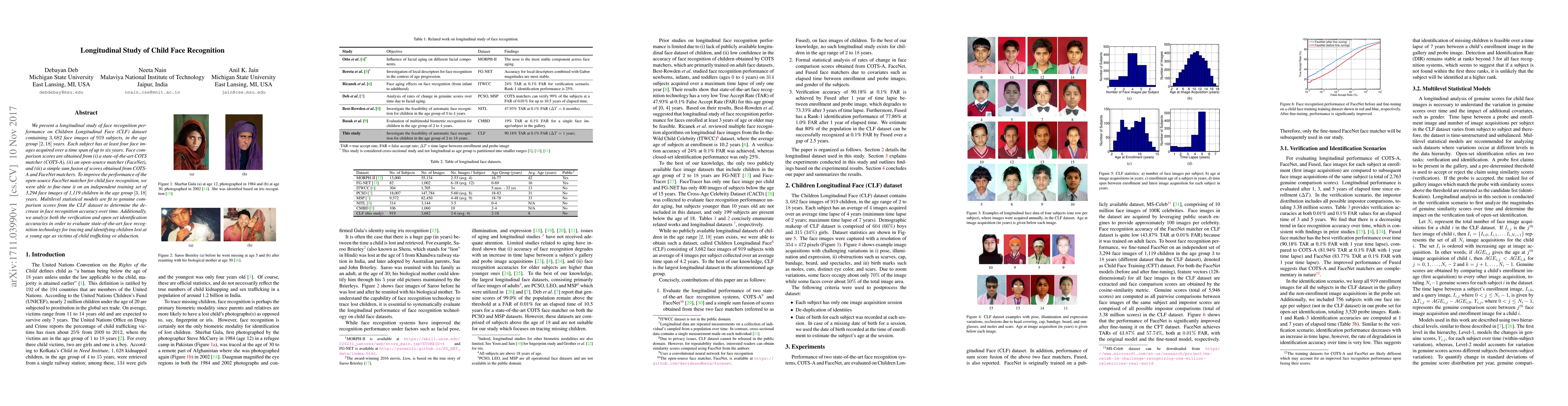This longitudinal study assesses face recognition performance in children using the CLF dataset, comparing state-of-the-art, open-source, and fused matcher techniques. Fine-tuned FaceNet matcher shows improved performance, and statistical models reveal decreasing recognition accuracy over time, crucial for identifying children in trafficking cases.