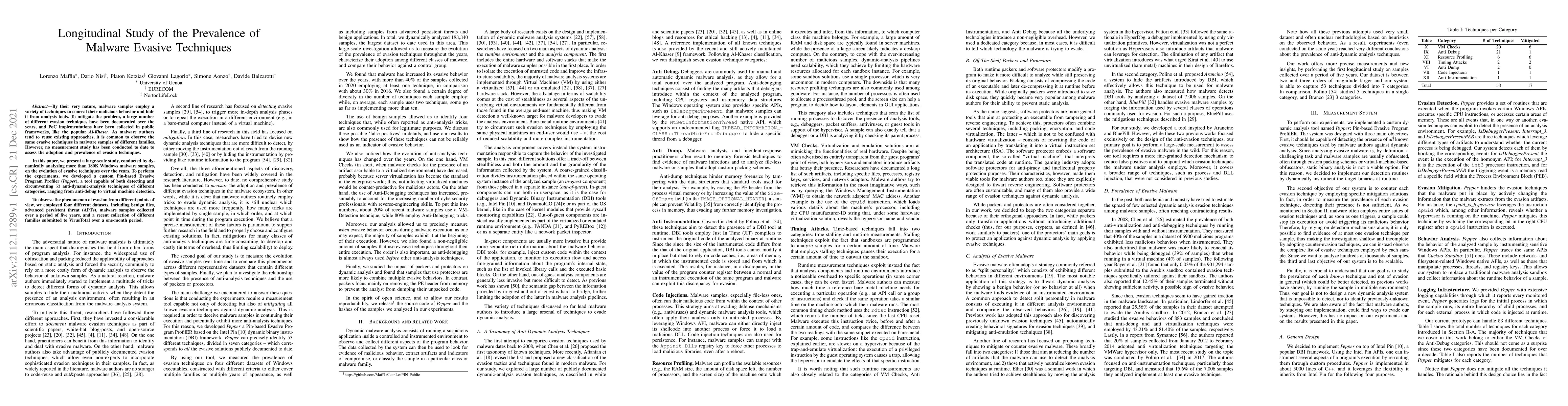 This paper presents a large-scale longitudinal study analyzing the prevalence and evolution of malware evasive techniques by dynamically examining over 180K Windows malware samples. The study employs a custom tool, Pepper, to detect and bypass 53 anti-dynamic-analysis techniques, and uses four datasets to observe evasion trends over time.