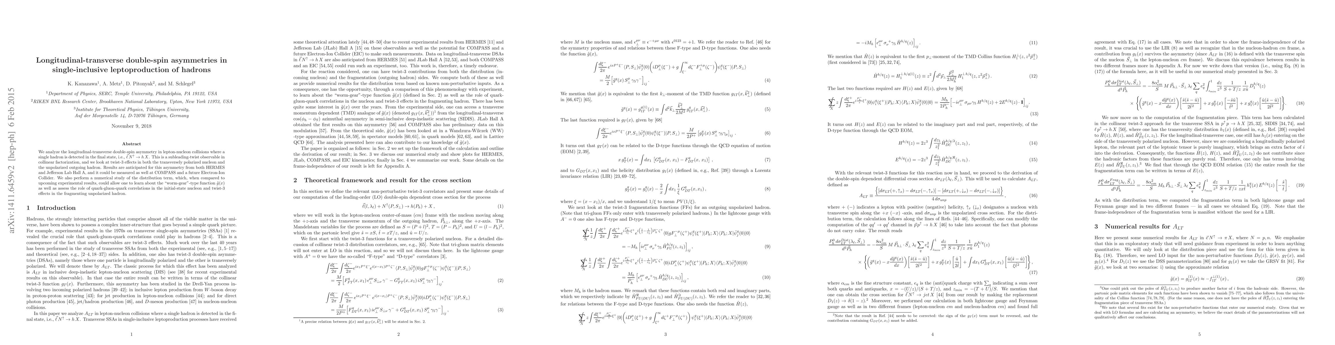 This paper explores double-spin asymmetries in lepton-nucleon collisions producing single hadrons, focusing on twist-3 effects. Results are expected from HERMES, Jefferson Lab Hall A, and potential measurements at COMPASS and a future Electron-Ion Collider. A numerical study of distribution terms may reveal insights into the 'worm-gear'-type function and quark-gluon-quark correlations.