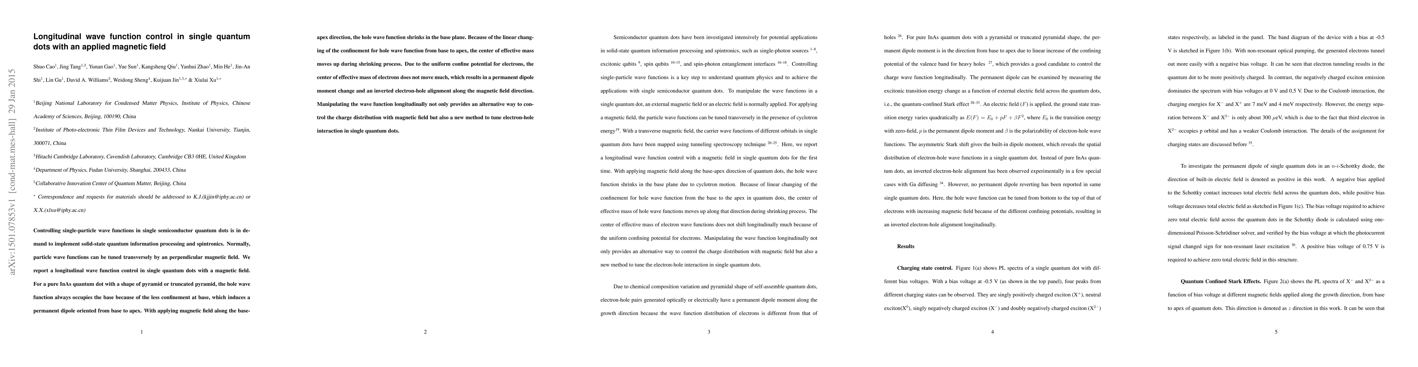 This paper reports a novel method for longitudinal control of hole wave functions in single InAs quantum dots using an applied magnetic field along the base-apex direction, which shifts the effective mass center and alters the electron-hole alignment, offering new avenues for quantum information processing and spintronics.