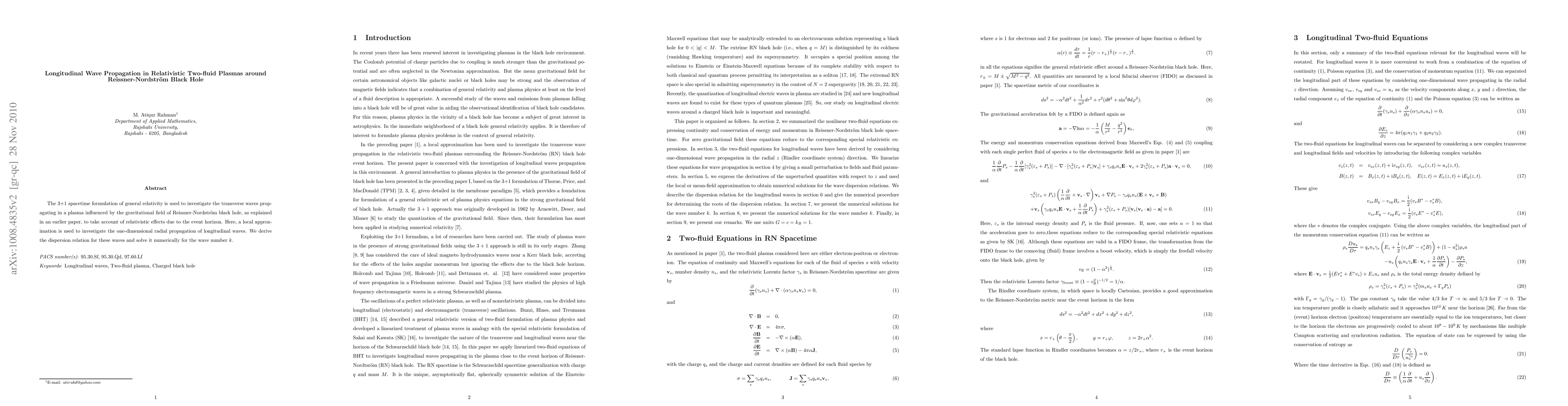 This paper explores the propagation of longitudinal waves in relativistic two-fluid plasmas near a Reissner-Nordstrom black hole using the 3+1 formulation of general relativity. The study derives a dispersion relation for these waves and solves it numerically to determine the wave number k.
