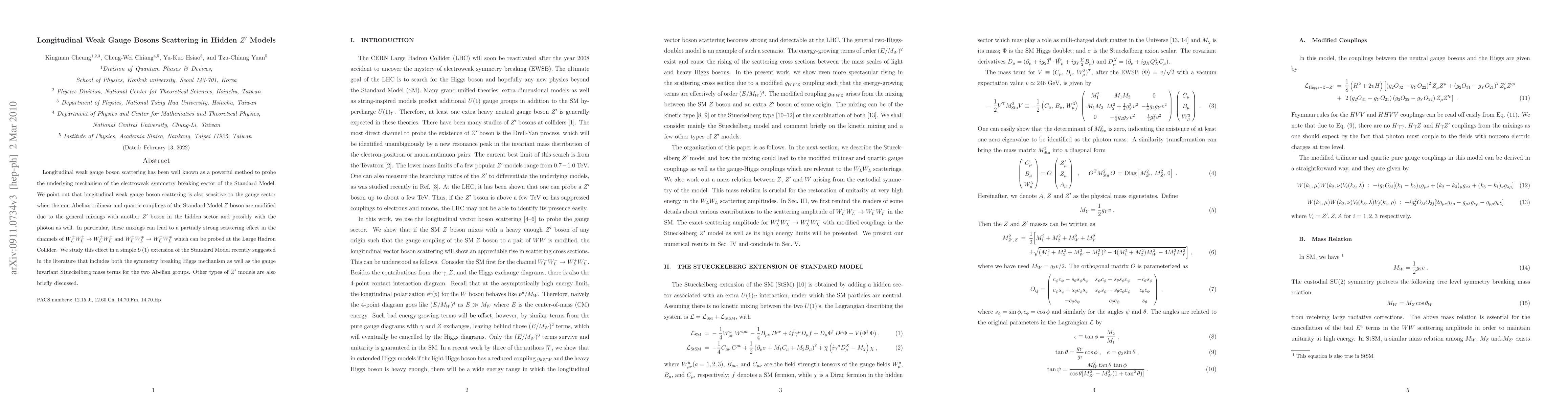 Longitudinal weak gauge boson scattering has been well known as a powerful method to probe the underlying mechanism of the electroweak symmetry breaking sector of the Standard Model. We point out that longitudinal weak gauge boson scattering is also sensitive to the gauge sector when the non-Abelian trilinear and quartic couplings of the Standard Model Z boson are modified due to the general mixings with another Z' boson in the hidden sector and possibly with the photon as well. In particular, these mixings can lead to a partially strong scattering effect in the channels of W^\pm_L W^\pm_L \to W^\pm_L W^\pm_L and W^\pm_L W^\mp_L \to W^\pm_L W^\mp_L which can be probed at the Large Hadron Collider. We study this effect in a simple U(1) extension of the Standard Model recently suggested in the literature that includes both the symmetry breaking Higgs mechanism as well as the gauge invariant Stueckelberg mass terms for the two Abelian groups. Other types of Z' models are also briefly discussed.