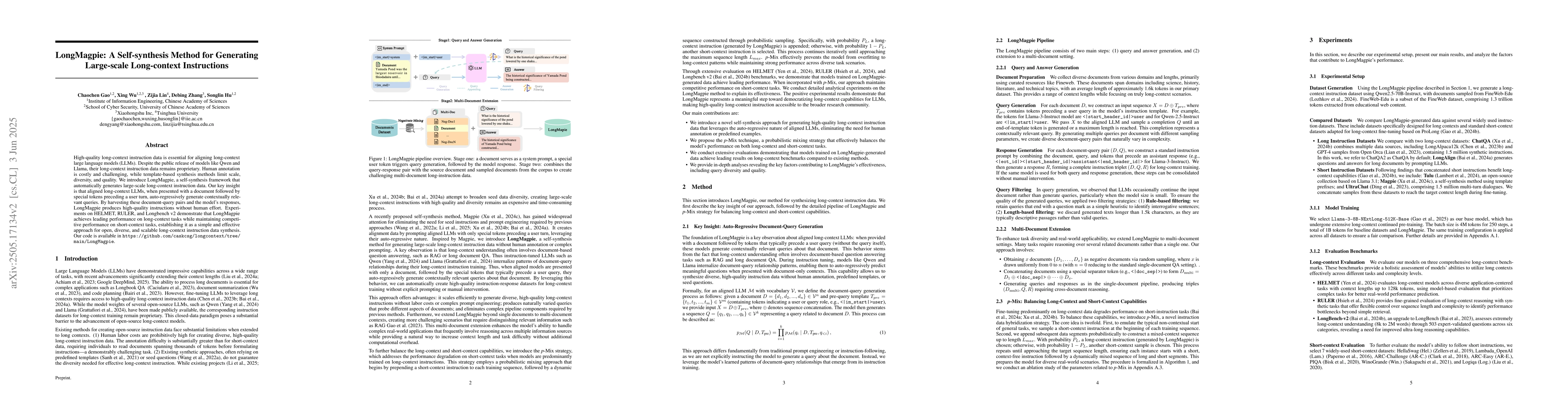 Researchers introduced LongMagpie, a self-synthesis method that automatically generates large-scale long-context instruction data for aligning large language models. It achieves leading performance on long-context tasks while maintaining competitive performance on short-context tasks.