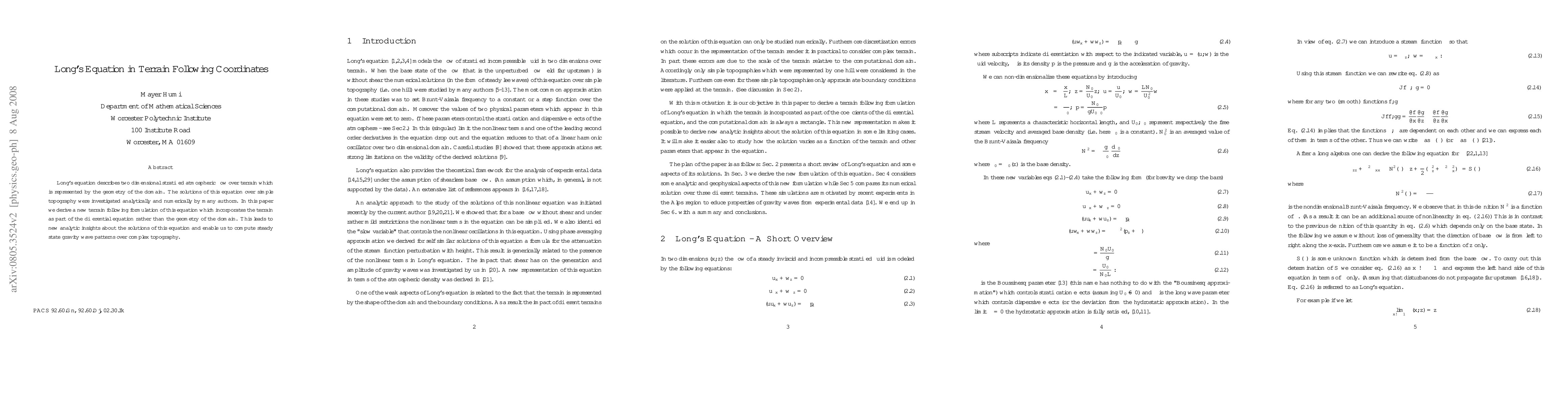 Long's equation describes two dimensional stratified atmospheric flow over terrain which is represented by the geometry of the domain. The solutions of this equation over simple topography were investigated analytically and numerically by many authors. In this paper we derive a new terrain following formulation of this equation which incorporates the terrain as part of the differential equation rather than the geometry of the domain. This leads to new analytic insights about the solutions of this equation and enable us to compute steady state gravity wave patterns over complex topography.
