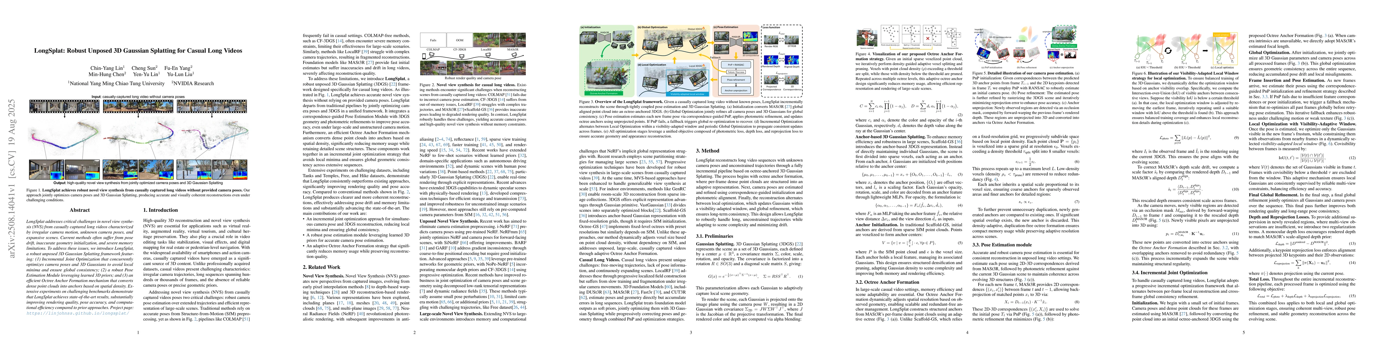 LongSplat introduces an unposed 3D Gaussian splatting framework for casual long videos, addressing challenges in novel view synthesis with irregular camera motion, unknown camera poses, and expansive scenes. It features incremental joint optimization, a robust pose estimation module leveraging learned 3D priors, and an efficient octree anchor formation mechanism.