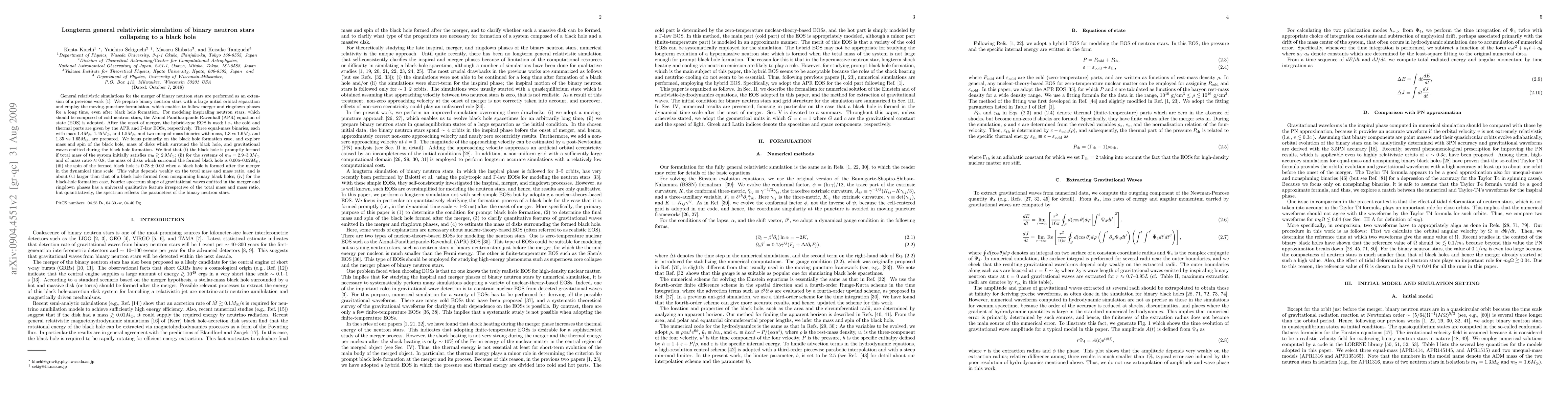 General relativistic simulations for the merger of binary neutron stars are performed as an extension of a previous work\cite{Shibata:2006nm}. We prepare binary neutron stars with a large initial orbital separation and employ the moving-puncture formulation, which enables to follow merger and ringdown phases for a long time, even after black hole formation. For modeling inspiraling neutron stars, which should be composed of cold neutron stars, the Akmal-Pandhalipande-Ravenhall (APR) equation of state (EOS) is adopted. After the onset of the merger, the hybrid-type EOS is used; i.e., the cold and thermal parts are given by the APR and $\Gamma$-law EOSs, respectively. Three equal-mass binaries each with mass $1.4M_\odot,1.45M_\odot,1.5M_\odot$ and two unequal-mass binaries with mass 1.3--$1.6M_\odot$, 1.35--$1.65M_\odot$ are prepared. We focus primarily on the black hole formation case, and explore mass and spin of the black hole, mass of disks which surround the black hole, and gravitational waves emitted during the black hole formation. We find that (i) for the systems of $m_0=2.9$--$3.0M_\odot$ and of mass ratio $\approx 0.8$, the mass of disks which surround the formed black hole is 0.006--$0.02M_{\odot}$; (ii) the spin of the formed black hole is $0.78 \pm 0.02$ when a black hole is formed after the merger in the dynamical time scale. This value depends weakly on the total mass and mass ratio, and is about 0.1 larger than that of a black hole formed from nonspinning binary black holes; (iii) for the black-hole formation case, Fourier spectrum shape of gravitational waves emitted in the merger and ringdown phases has a universal qualitative feature irrespective of the total mass and mass ratio, but quantitatively, the spectrum reflects the parameters of the binary neutron stars.