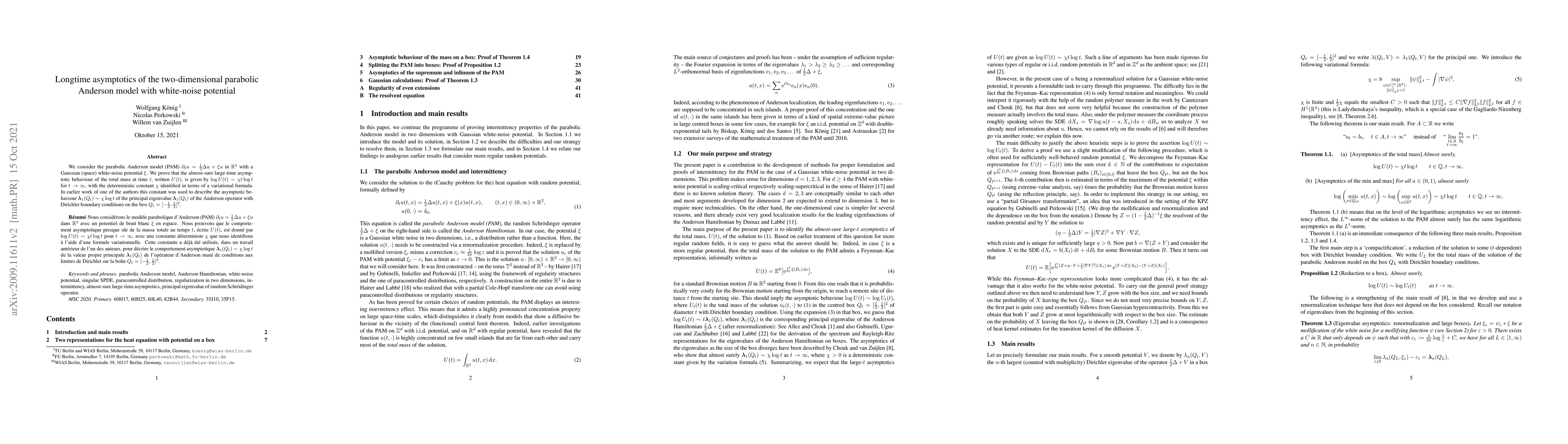 We consider the parabolic Anderson model (PAM) $\partial_t u = \frac12 \Delta u + \xi u$ in $\mathbb R^2$ with a Gaussian (space) white-noise potential $\xi$. We prove that the almost-sure large-time asymptotic behaviour of the total mass at time $t$, written $U(t)$, is given by $\log U(t)\sim \chi t \log t$ for $t \to \infty$, with the deterministic constant $\chi$ identified in terms of a variational formula. In earlier work of one of the authors this constant was used to describe the asymptotic behaviour $\boldsymbol \lambda_1(Q_t)\sim\chi\log t$ of the principal eigenvalue $\boldsymbol\lambda_1(Q_t)$ of the Anderson operator with Dirichlet boundary conditions on the box $Q_t= [-\frac{t}{2},\frac{t}{2}]^2$.