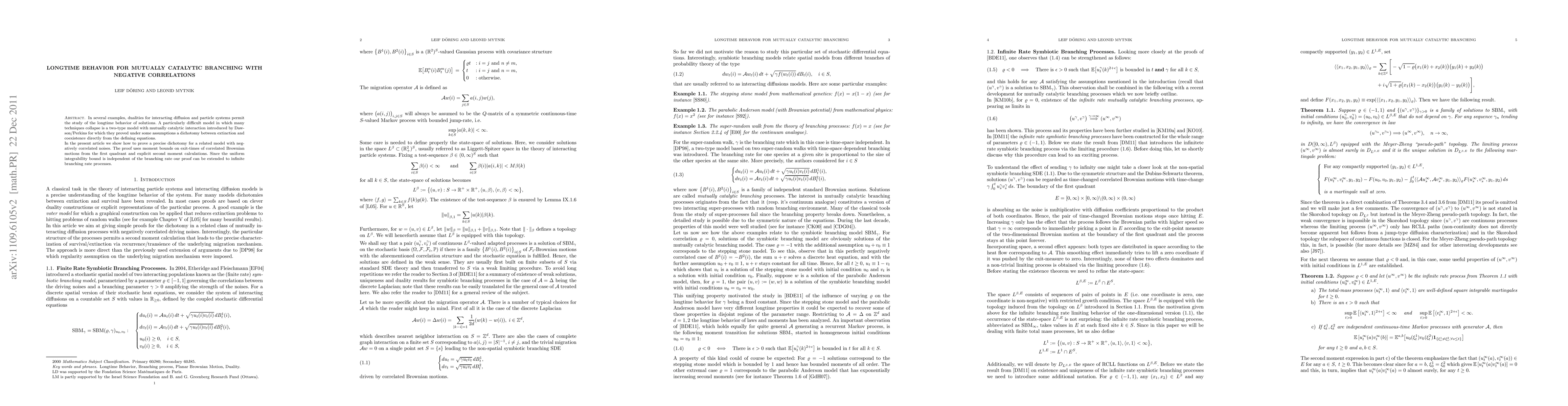 In several examples, dualities for interacting diffusion and particle systems permit the study of the longtime behavior of solutions. A particularly difficult model in which many techniques collapse is a two-type model with mutually catalytic interaction introduced by Dawson/Perkins for which they proved under some assumptions a dichotomy between extinction and coexistence directly from the defining equations. In the present article we show how to prove a precise dichotomy for a related model with negatively correlated noises. The proof uses moment bounds on exit-times of correlated Brownian motions from the first quadrant and explicit second moment calculations. Since the uniform integrability bound is independent of the branching rate our proof can be extended to infinite branching rate processes.