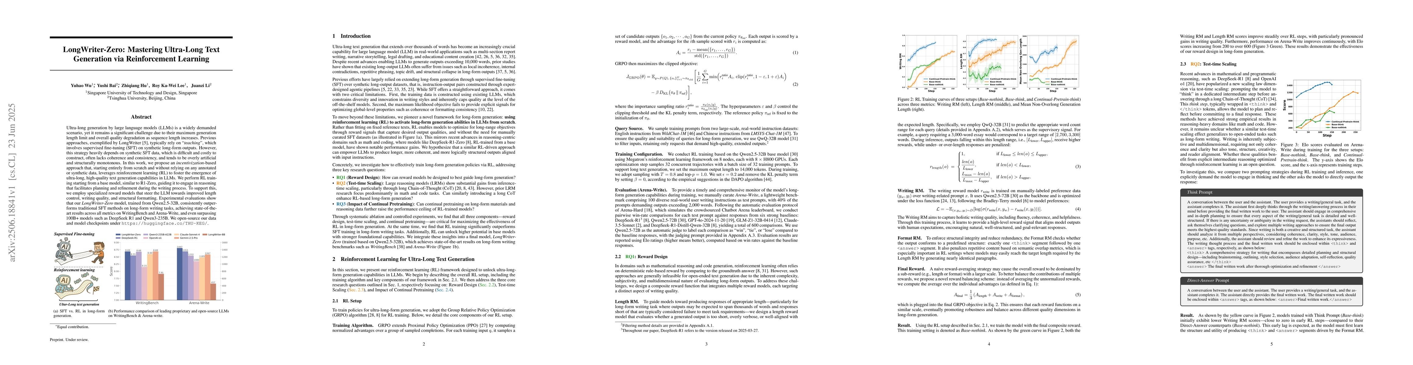 Ultra-long generation by large language models (LLMs) is a widely demanded scenario, yet it remains a significant challenge due to their maximum generation length limit and overall quality degradation as sequence length increases. Previous approaches, exemplified by LongWriter, typically rely on ''teaching'', which involves supervised fine-tuning (SFT) on synthetic long-form outputs. However, this strategy heavily depends on synthetic SFT data, which is difficult and costly to construct, often lacks coherence and consistency, and tends to be overly artificial and structurally monotonous. In this work, we propose an incentivization-based approach that, starting entirely from scratch and without relying on any annotated or synthetic data, leverages reinforcement learning (RL) to foster the emergence of ultra-long, high-quality text generation capabilities in LLMs. We perform RL training starting from a base model, similar to R1-Zero, guiding it to engage in reasoning that facilitates planning and refinement during the writing process. To support this, we employ specialized reward models that steer the LLM towards improved length control, writing quality, and structural formatting. Experimental evaluations show that our LongWriter-Zero model, trained from Qwen2.5-32B, consistently outperforms traditional SFT methods on long-form writing tasks, achieving state-of-the-art results across all metrics on WritingBench and Arena-Write, and even surpassing 100B+ models such as DeepSeek R1 and Qwen3-235B. We open-source our data and model checkpoints under https://huggingface.co/THU-KEG/LongWriter-Zero-32B