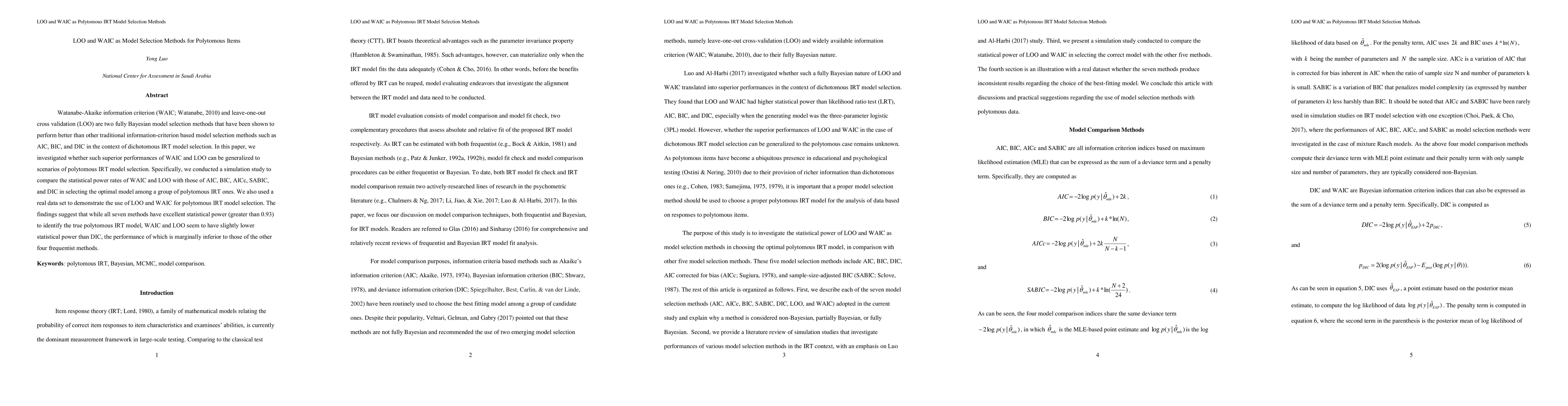 Watanabe-Akaike information criterion (WAIC; Watanabe, 2010) and leave-one-out cross validation (LOO) are two fully Bayesian model selection methods that have been shown to perform better than other traditional information-criterion based model selection methods such as AIC, BIC, and DIC in the context of dichotomous IRT model selection. In this paper, we investigated whether such superior performances of WAIC and LOO can be generalized to scenarios of polytomous IRT model selection. Specifically, we conducted a simulation study to compare the statistical power rates of WAIC and LOO with those of AIC, BIC, AICc, SABIC, and DIC in selecting the optimal model among a group of polytomous IRT ones. We also used a real data set to demonstrate the use of LOO and WAIC for polytomous IRT model selection. The findings suggest that while all seven methods have excellent statistical power (greater than 0.93) to identify the true polytomous IRT model, WAIC and LOO seem to have slightly lower statistical power than DIC, the performance of which is marginally inferior to those of the other four frequentist methods. Keywords: polytomous IRT, Bayesian, MCMC, model comparison.