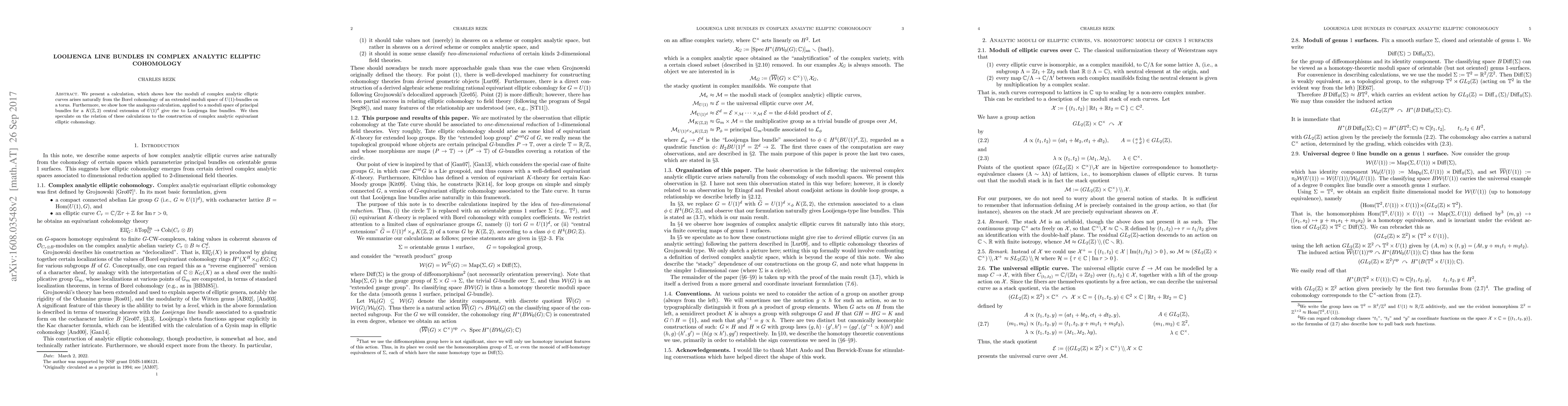 We present a calculation, which shows how the moduli of complex analytic elliptic curves arises naturally from the Borel cohomology of an extended moduli space of $U(1)$-bundles on a torus. Furthermore, we show how the analogous calculation, applied to a moduli space of principal bundles for a $K(\mathbb{Z},2)$ central extension of $U(1)^d$ give rise to Looijenga line bundles. We then speculate on the relation of these calculations to the construction of complex analytic equivariant elliptic cohomology.