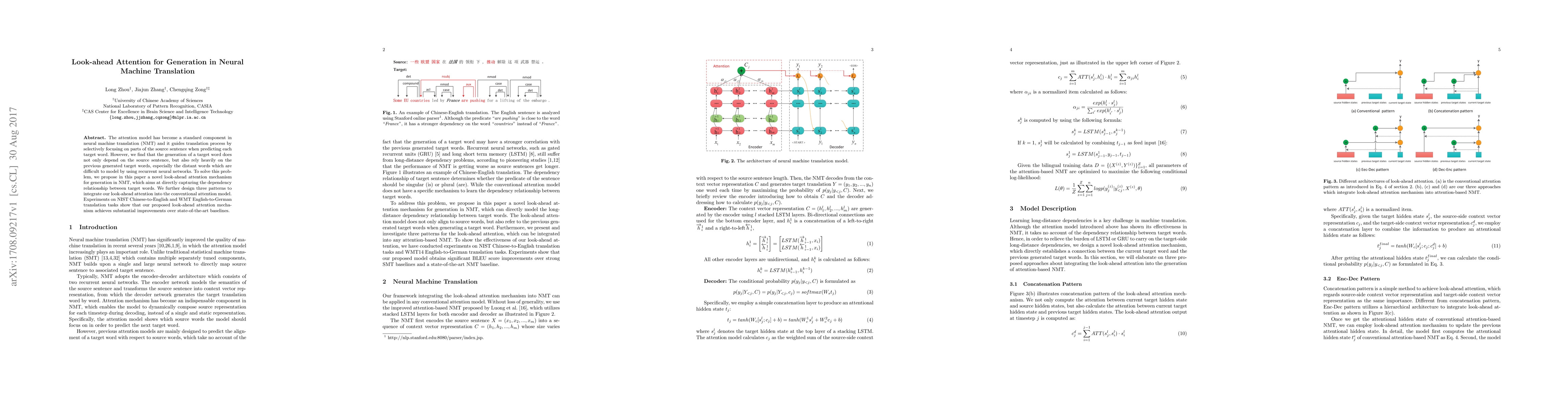 This paper introduces a novel look-ahead attention mechanism to enhance neural machine translation (NMT) by directly modeling dependencies between target words, including distant ones. The proposed method integrates three patterns into the conventional attention model, demonstrating significant improvements over existing baselines in Chinese-to-English and English-to-German translation tasks.