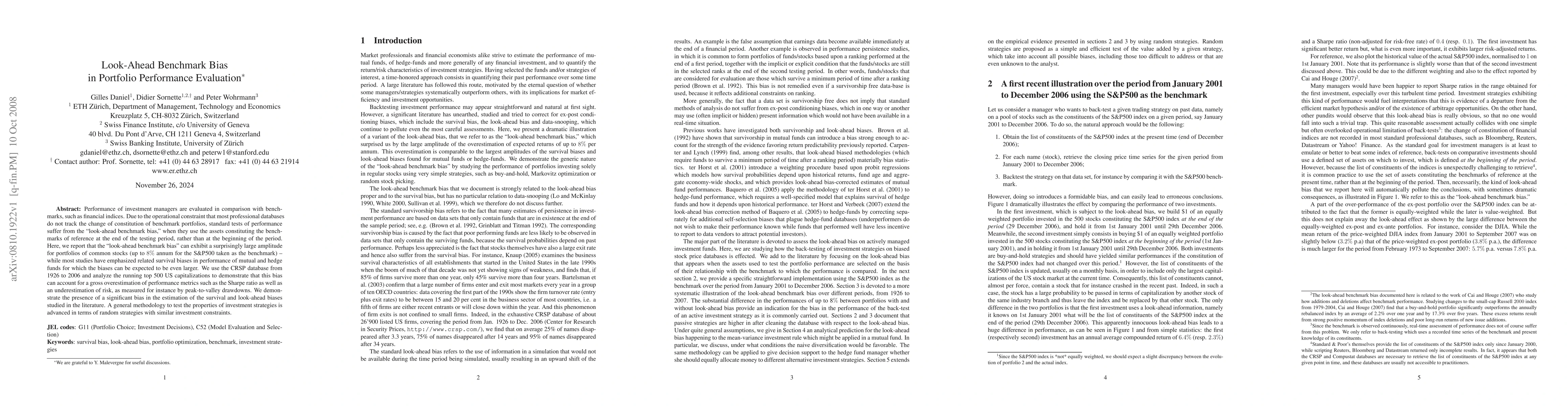 Performance of investment managers are evaluated in comparison with benchmarks, such as financial indices. Due to the operational constraint that most professional databases do not track the change of constitution of benchmark portfolios, standard tests of performance suffer from the "look-ahead benchmark bias," when they use the assets constituting the benchmarks of reference at the end of the testing period, rather than at the beginning of the period. Here, we report that the "look-ahead benchmark bias" can exhibit a surprisingly large amplitude for portfolios of common stocks (up to 8% annum for the S&P500 taken as the benchmark) -- while most studies have emphasized related survival biases in performance of mutual and hedge funds for which the biases can be expected to be even larger. We use the CRSP database from 1926 to 2006 and analyze the running top 500 US capitalizations to demonstrate that this bias can account for a gross overestimation of performance metrics such as the Sharpe ratio as well as an underestimation of risk, as measured for instance by peak-to-valley drawdowns. We demonstrate the presence of a significant bias in the estimation of the survival and look-ahead biases studied in the literature. A general methodology to test the properties of investment strategies is advanced in terms of random strategies with similar investment constraints.