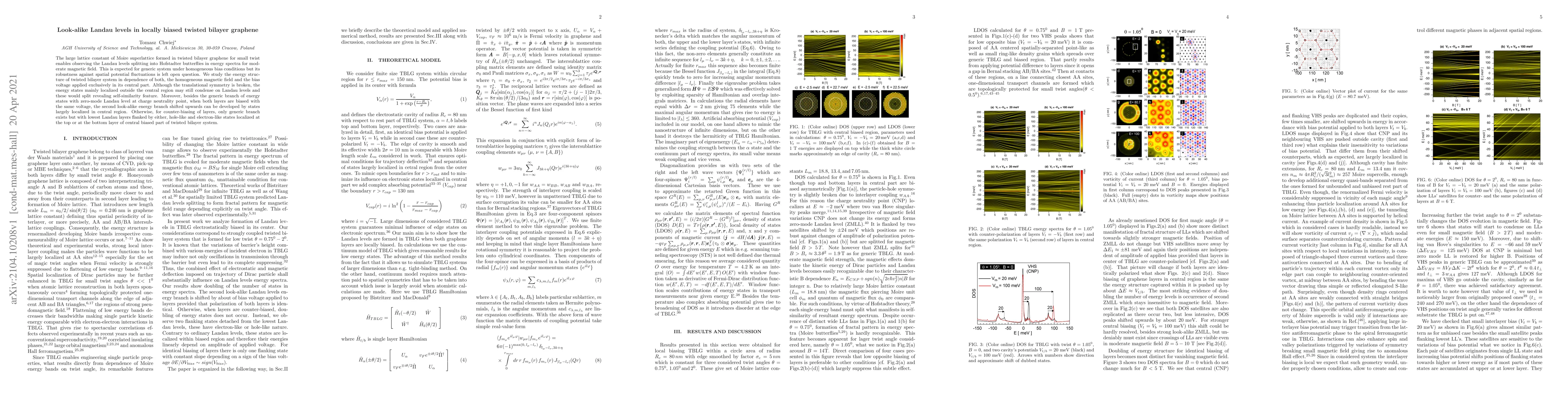 This study investigates Landau levels in twisted bilayer graphene under a local bias, revealing split levels forming Hofstadter butterflies. Even with broken translational symmetry due to localized bias, energy states condense on Landau levels, showing self-similarity; additionally, a second shifted branch forms under uniform bias, while counter-biasing only affects the lowest Landau levels.