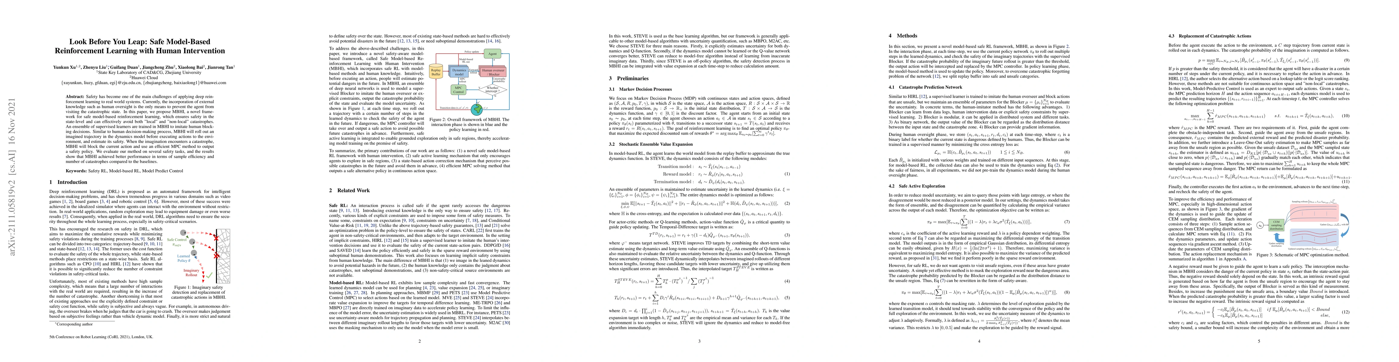 This paper introduces MBHI, a framework for safe model-based reinforcement learning that incorporates human intervention to prevent catastrophic states. MBHI uses an ensemble of supervised learners to mimic human blocking decisions and employs model-based planning to estimate and avoid potential catastrophes before action execution.