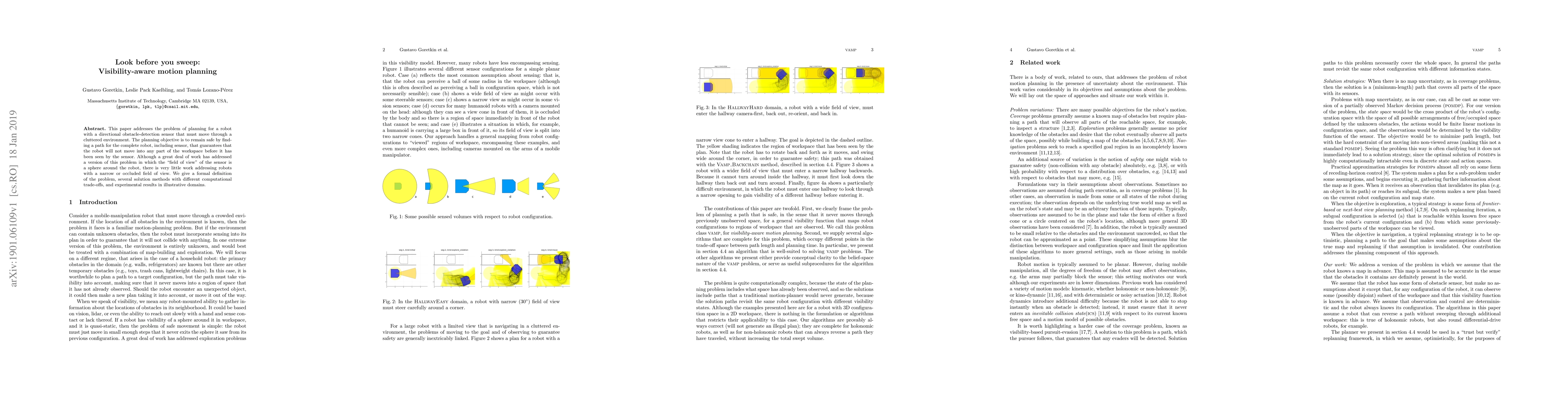 This paper addresses the problem of planning for a robot with a directional obstacle-detection sensor that must move through a cluttered environment. The planning objective is to remain safe by finding a path for the complete robot, including sensor, that guarantees that the robot will not move into any part of the workspace before it has been seen by the sensor. Although a great deal of work has addressed a version of this problem in which the "field of view" of the sensor is a sphere around the robot, there is very little work addressing robots with a narrow or occluded field of view. We give a formal definition of the problem, several solution methods with different computational trade-offs, and experimental results in illustrative domains.