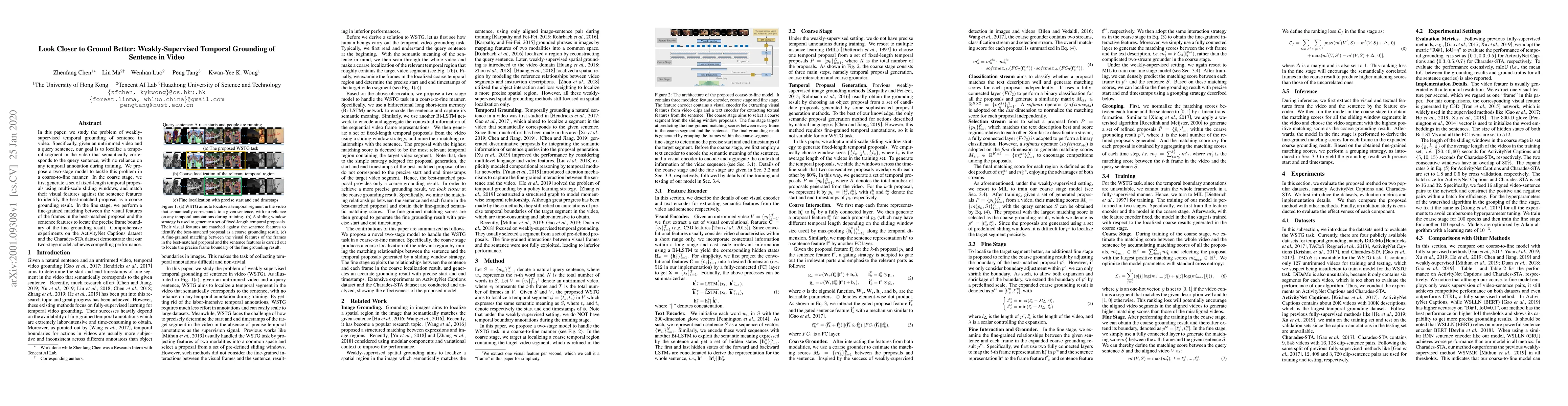 This paper proposes a two-stage model for weakly-supervised temporal grounding of sentences in video, achieving precise localization without temporal annotations. The coarse stage uses multi-scale sliding windows, and the fine stage refines the localization by matching frame features with sentence features.