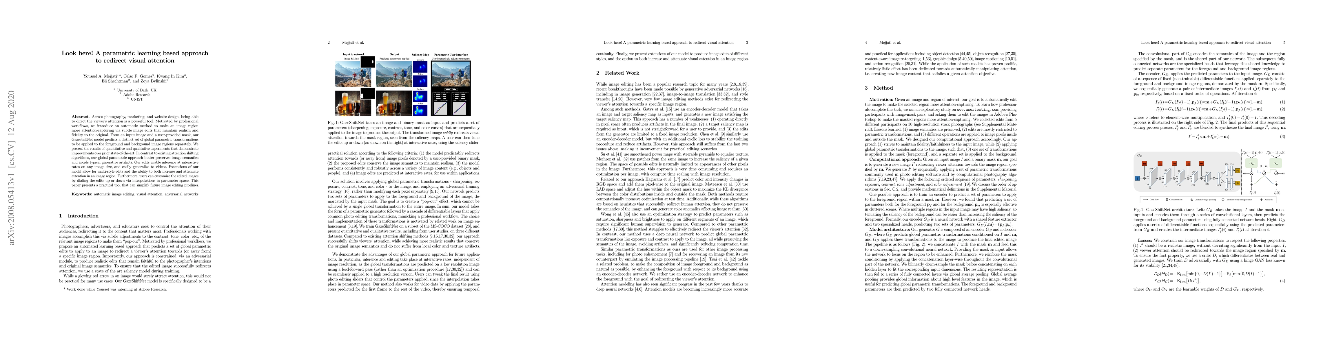 Across photography, marketing, and website design, being able to direct the viewer's attention is a powerful tool. Motivated by professional workflows, we introduce an automatic method to make an image region more attention-capturing via subtle image edits that maintain realism and fidelity to the original. From an input image and a user-provided mask, our GazeShiftNet model predicts a distinct set of global parametric transformations to be applied to the foreground and background image regions separately. We present the results of quantitative and qualitative experiments that demonstrate improvements over prior state-of-the-art. In contrast to existing attention shifting algorithms, our global parametric approach better preserves image semantics and avoids typical generative artifacts. Our edits enable inference at interactive rates on any image size, and easily generalize to videos. Extensions of our model allow for multi-style edits and the ability to both increase and attenuate attention in an image region. Furthermore, users can customize the edited images by dialing the edits up or down via interpolations in parameter space. This paper presents a practical tool that can simplify future image editing pipelines.